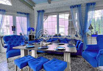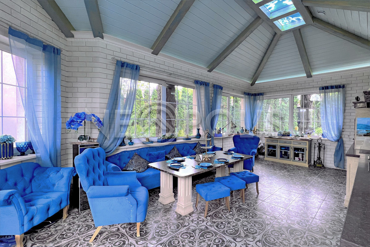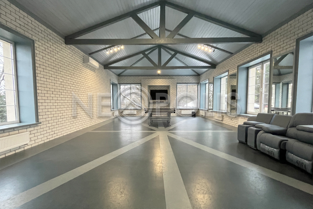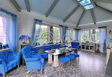 - Потолки: в основном доме - 2 склеенных гипсокартона толщиной 12 см, оштукатурены. В гостевом доме потолки окрашены. В спортзале и зимнем саду потолки отделаны лиственницей, окрашены
