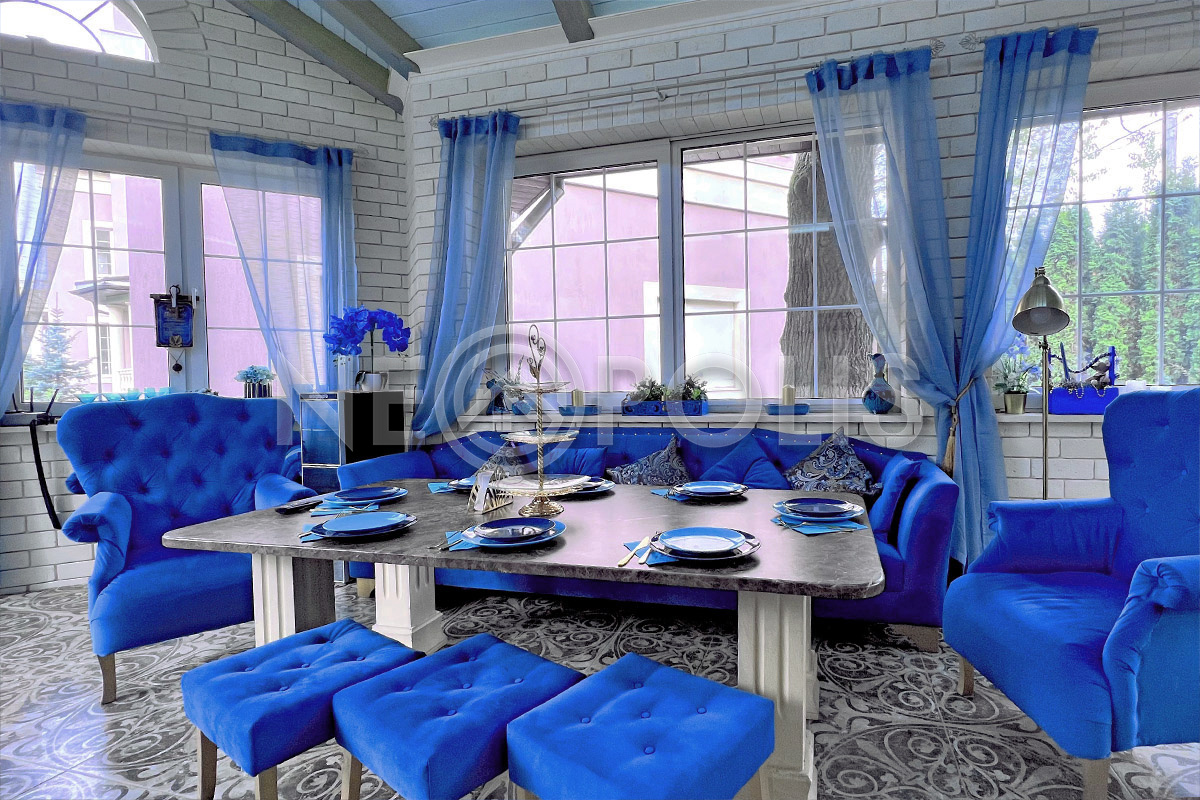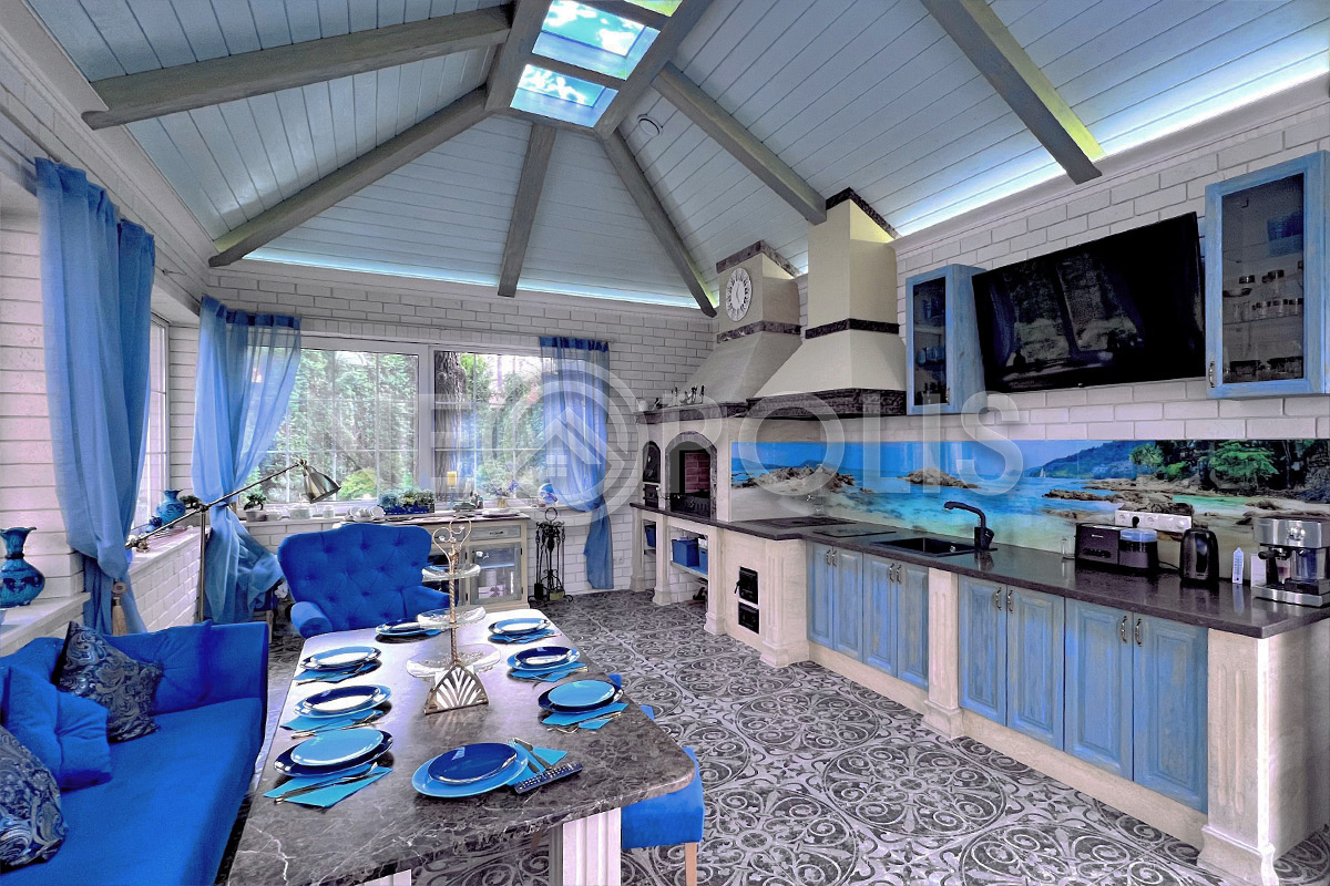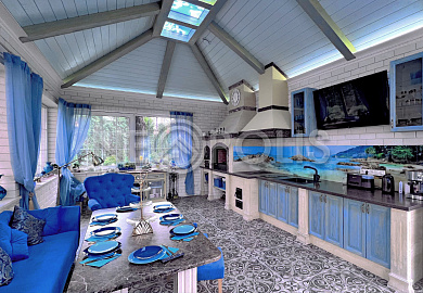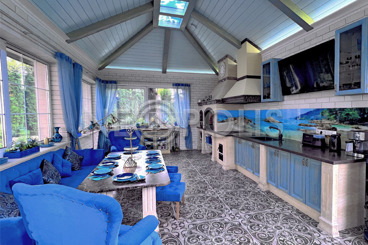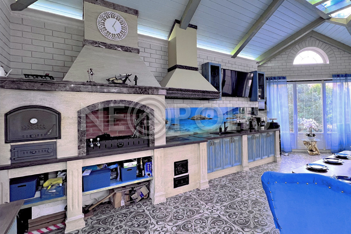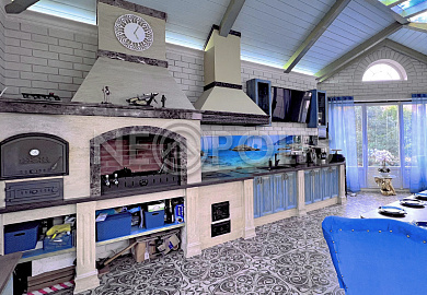 Павильон с летней кухней 56 кв.м (из камня, в стиле основного дома). Пол отделан керамогранитом (Испания) (теплый водяной пол).