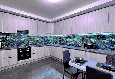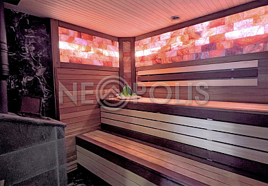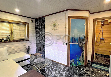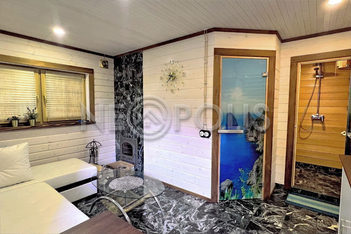 Пол в банном отсеке - натуральный змеевик; стены в парилке отделаны канадским кедром, полки из абаша.