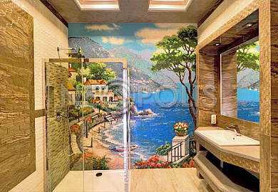 - Полы: штучный мрамор Emperador Dark, Emperador Light, рисунок - ковры в стиле Versace (ручной сборки). Пол в спортзале из португальской пробки. Закуплена пробковая плитка и подготовлен пол в бильярдной