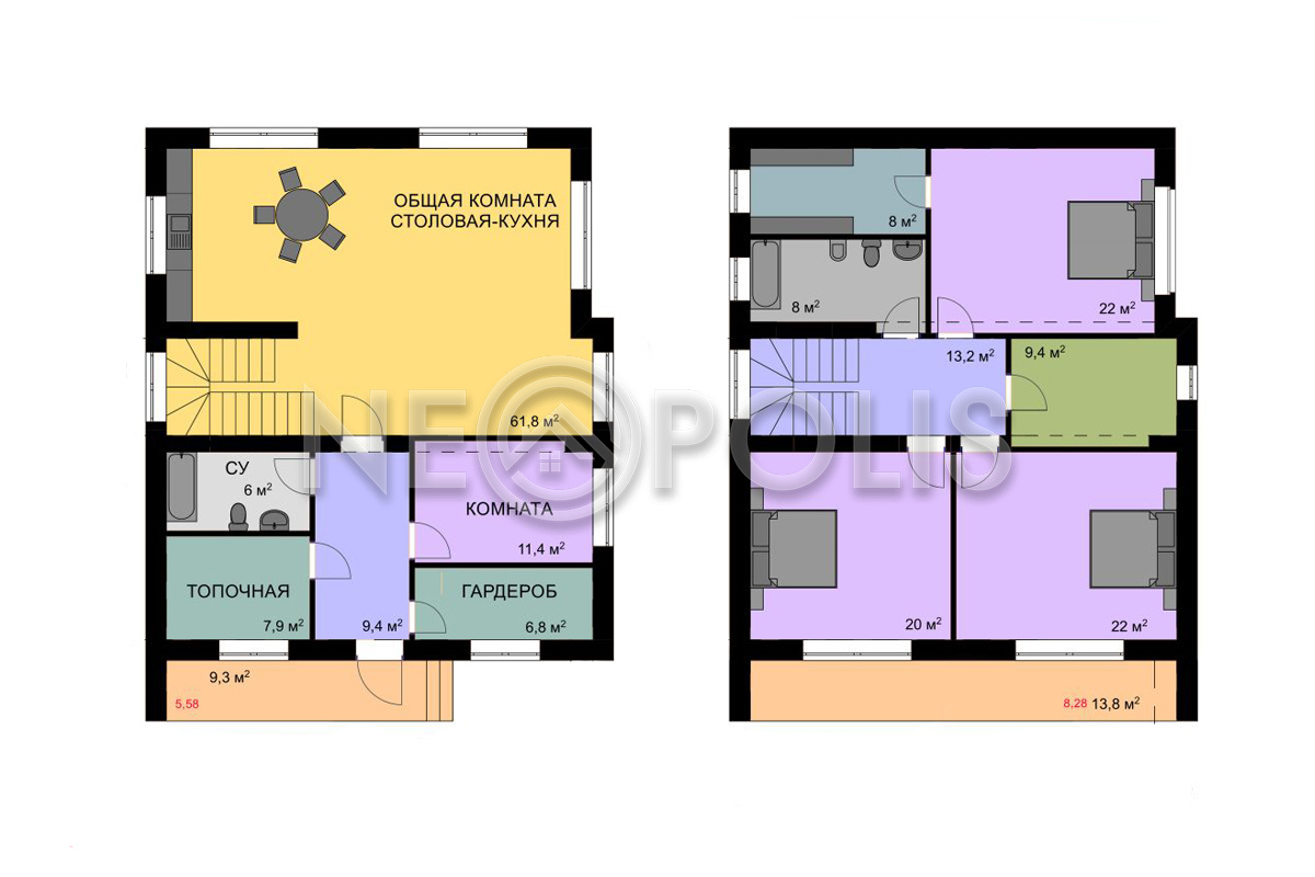 - 2 этаж:холл, мастер-спальня с гардеробной, две спальни, гардеробная, санузел.