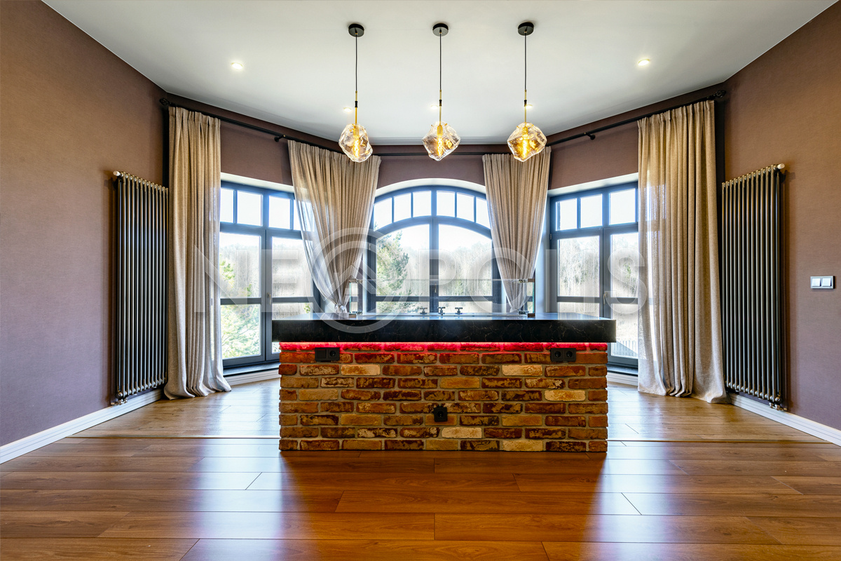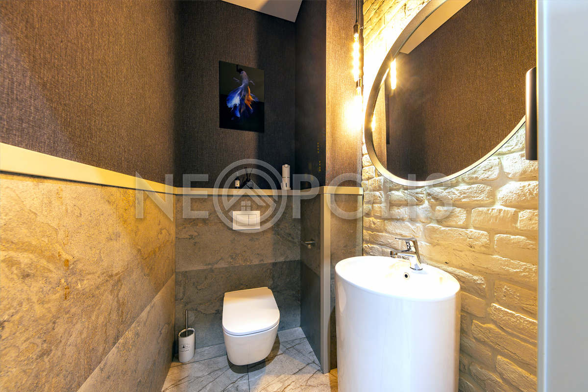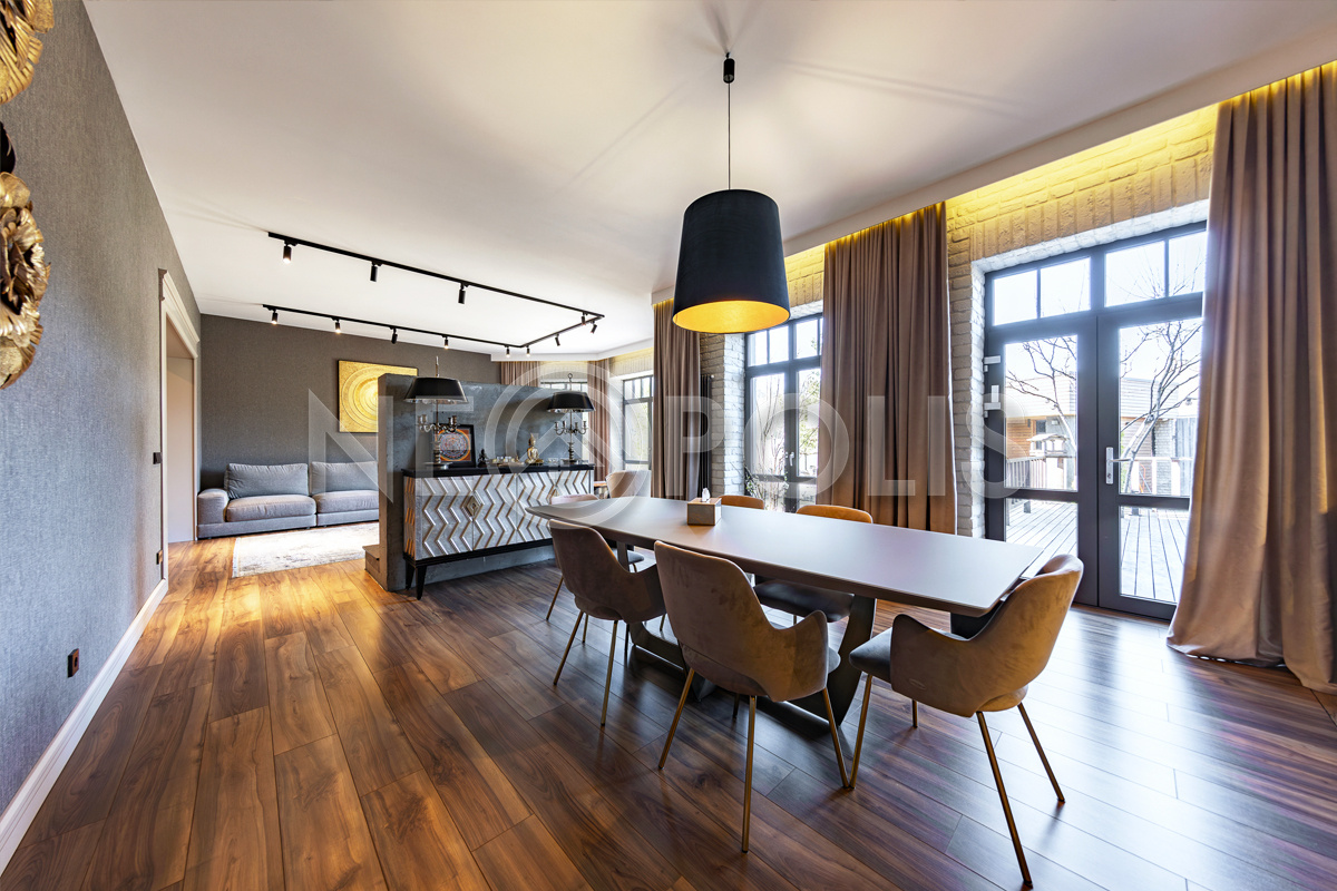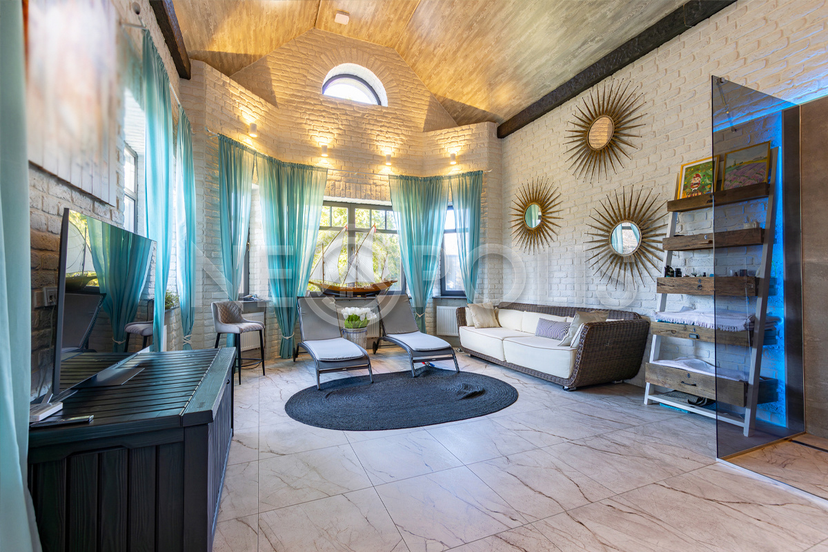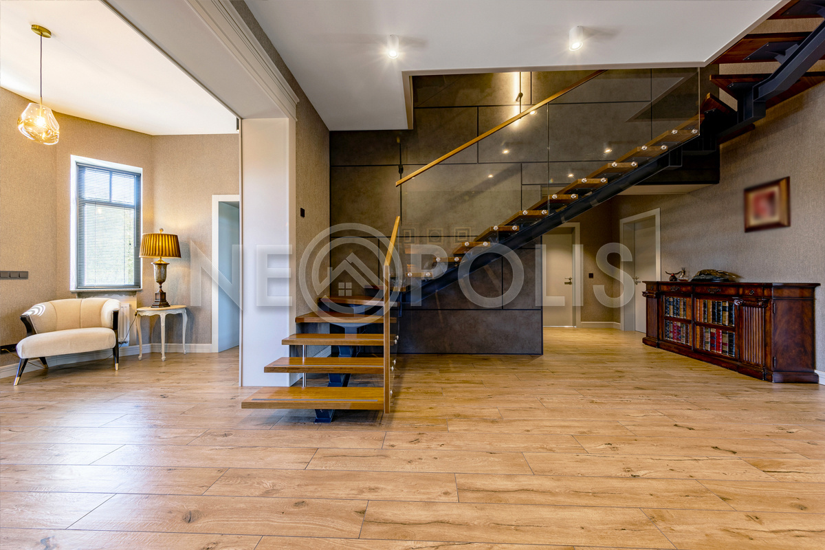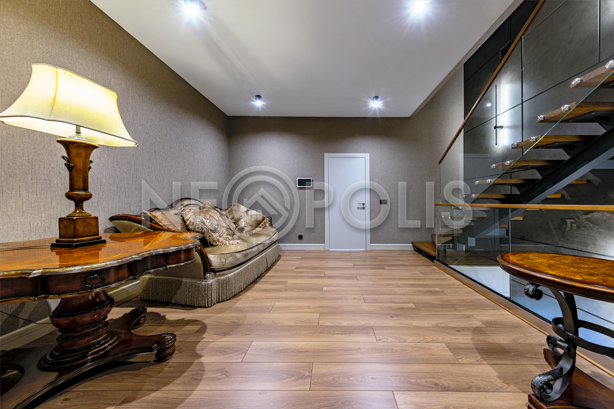 - 1 этаж:прихожая, холл, кухня – столовая, гостиная с камином и выходом на открытую террасу, кабинет, гостевой санузел, 3 гардеробных комнаты, зона с закрытой системой хранения около кухни, SPA зона с хамамом, душевой, санузлом и комнатой отдыха, постирочная, котельная, гараж на 2 авто