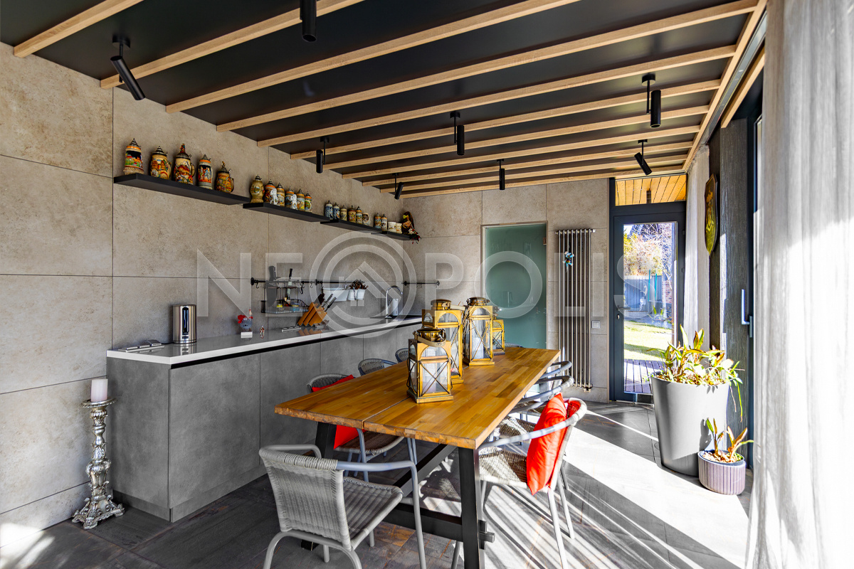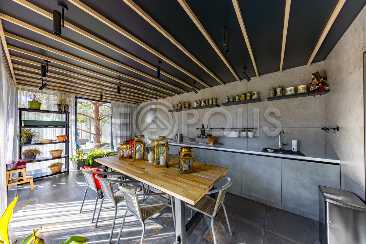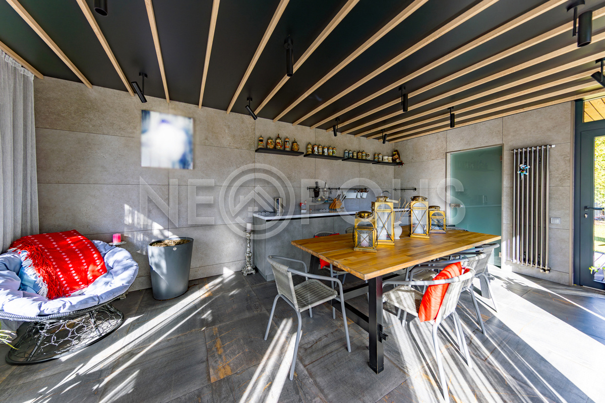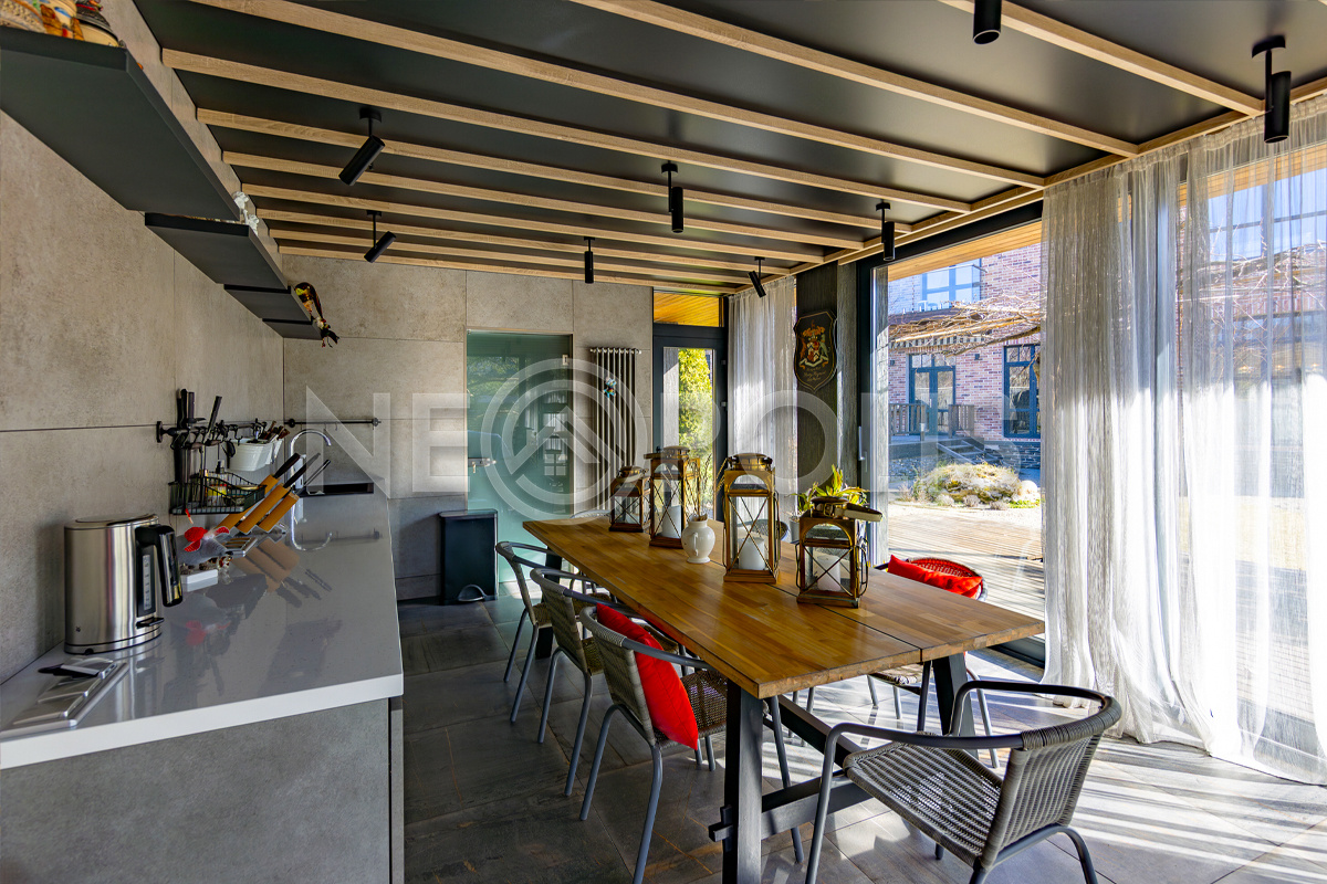 Беседка (кирпич + стекло + керамогранит + дерево) с отоплением, теплыми полами, кухонной зоной, санузлом и открытой террасой, имеет сдвижное панорамное остекление и солнцезащитную маркизу на веранде