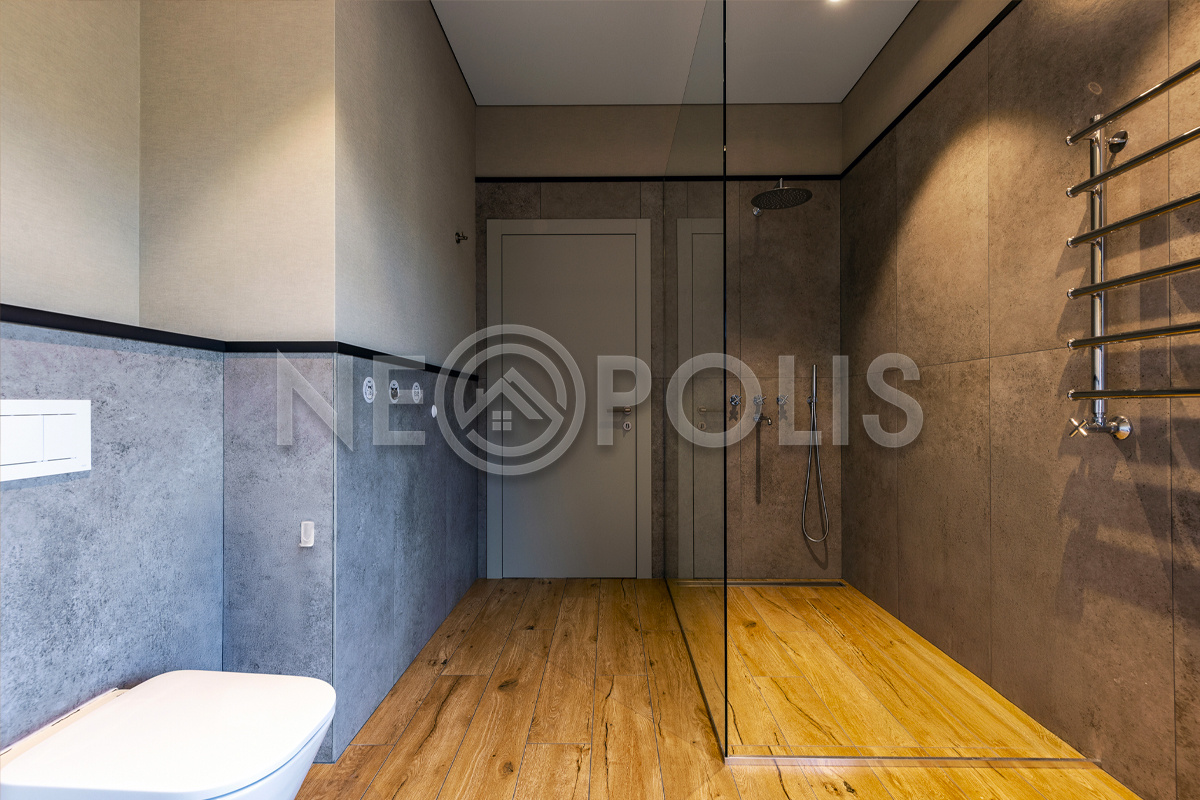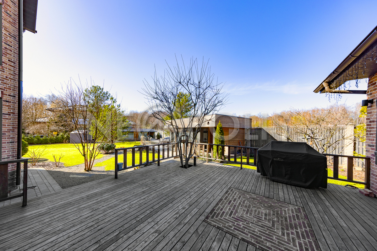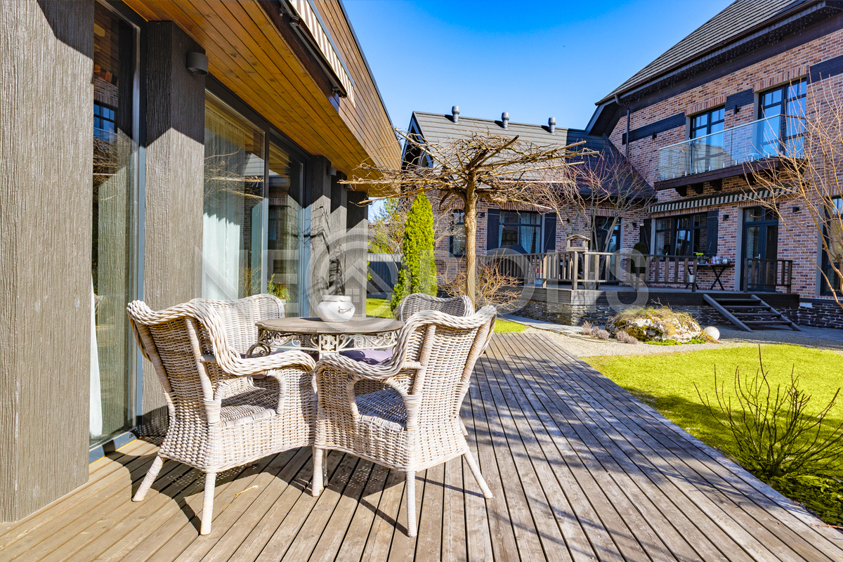 - Полы: уличное покрытие террас из массива лиственницы. В доме на полах лежит испанский керамогранит с подогревом и французская инженерная доска.