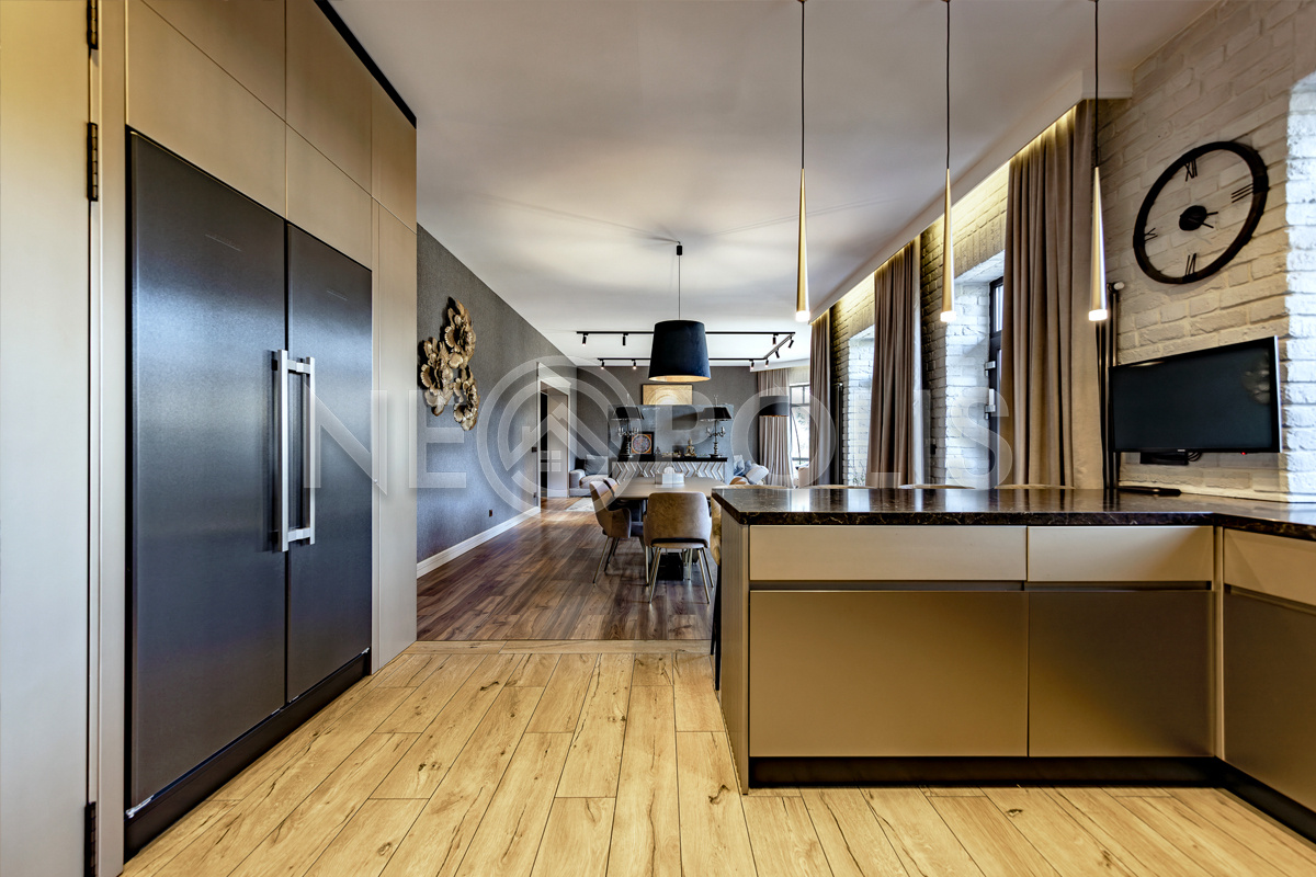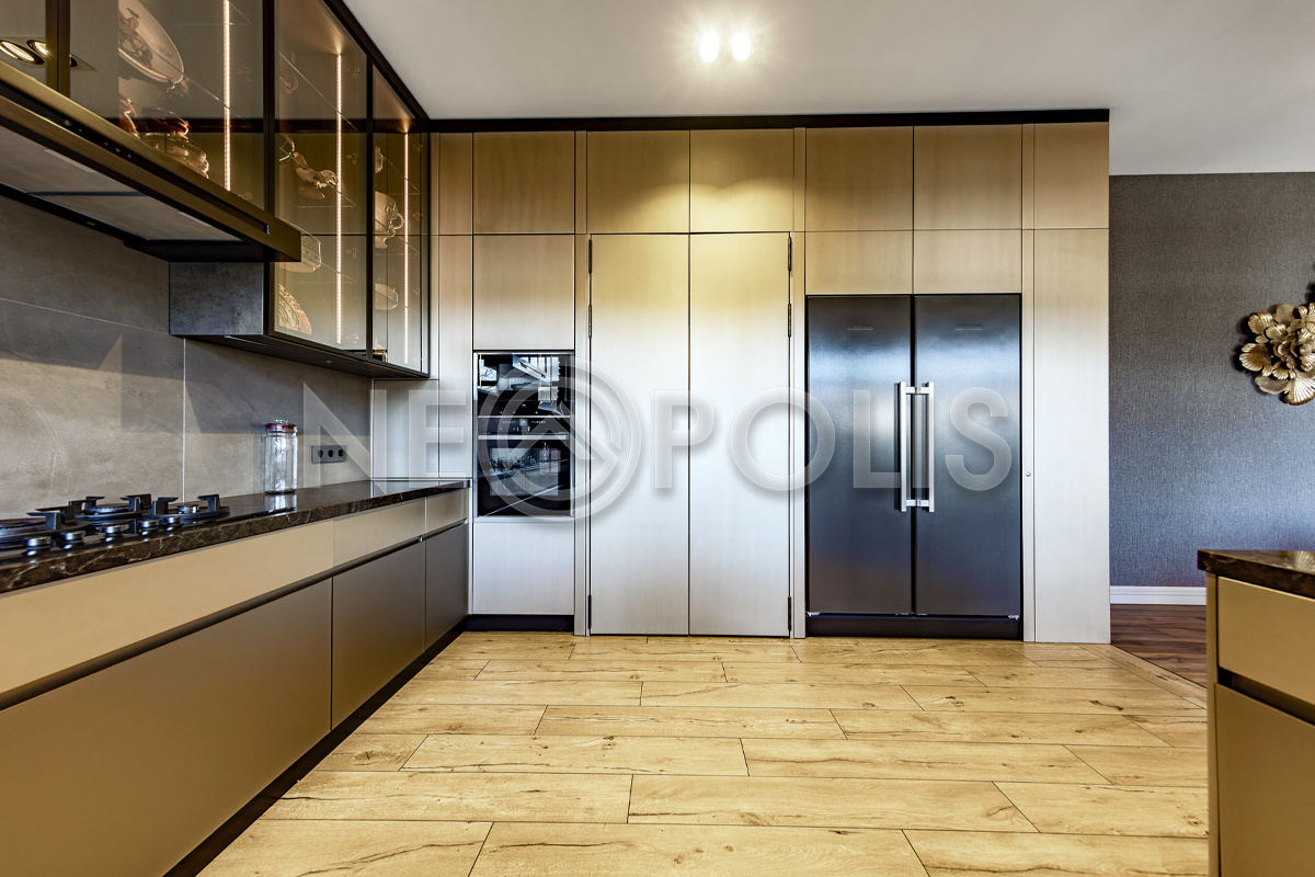 Мебель: премиальный кухонный гарнитур Джулия Новарс с встроенной бытовой техникой Neff и посудомоечной машиной Boch.