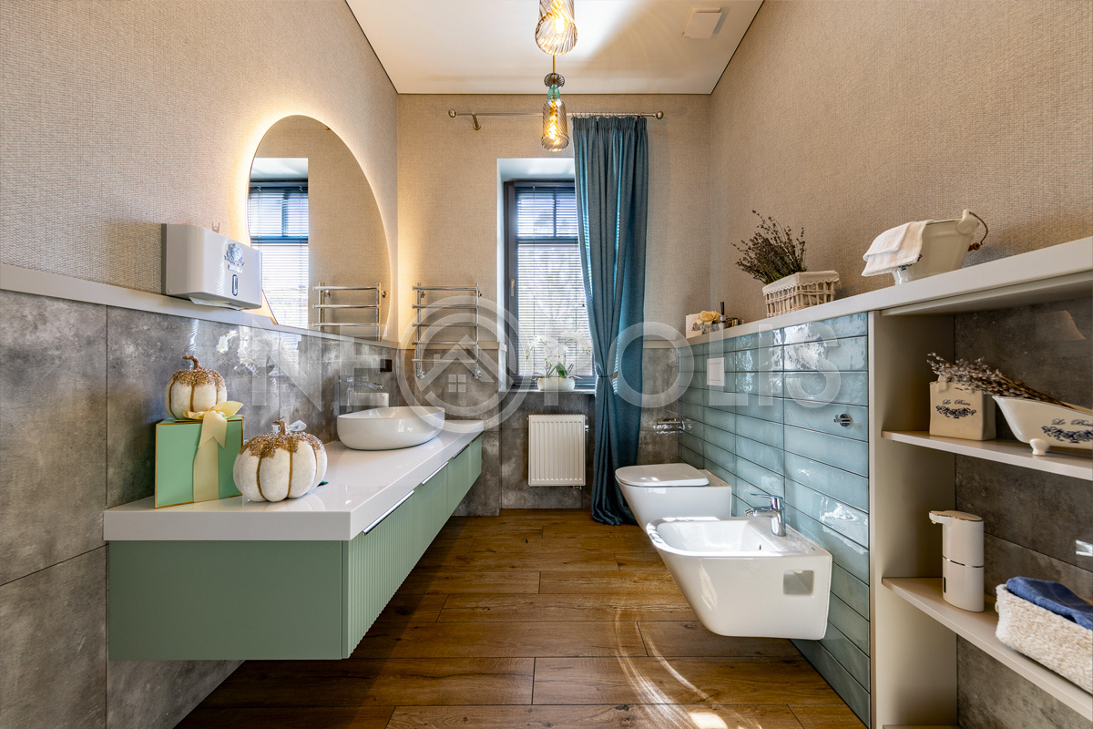 - Сантехника: сантехника Roca (Испания), смесители Grohe (Германия), на кухне смеситель Axor (Германия)