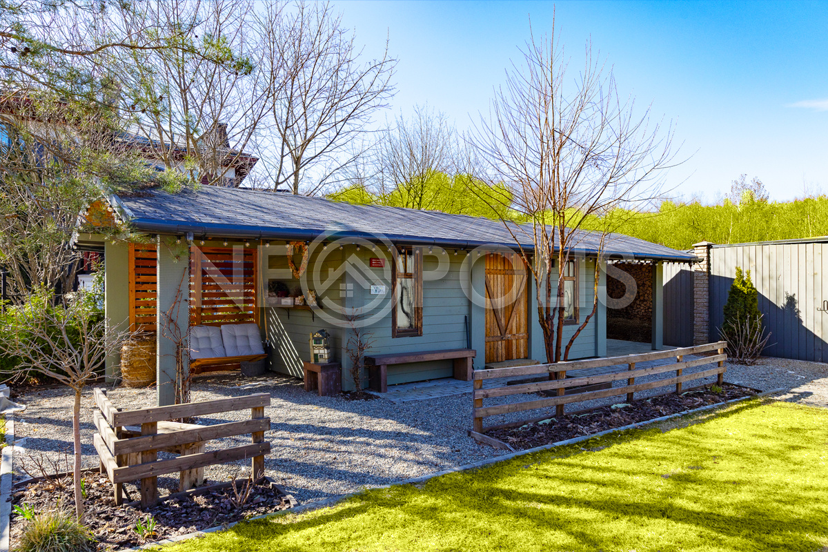 Одноэтажная постройка, за миниатюрным забором, стилизованная под американское мини-ранчо, включает в себя: дровница, гараж для строительной техники, мастерская – зона хранения, лаунж-зона с качелями.