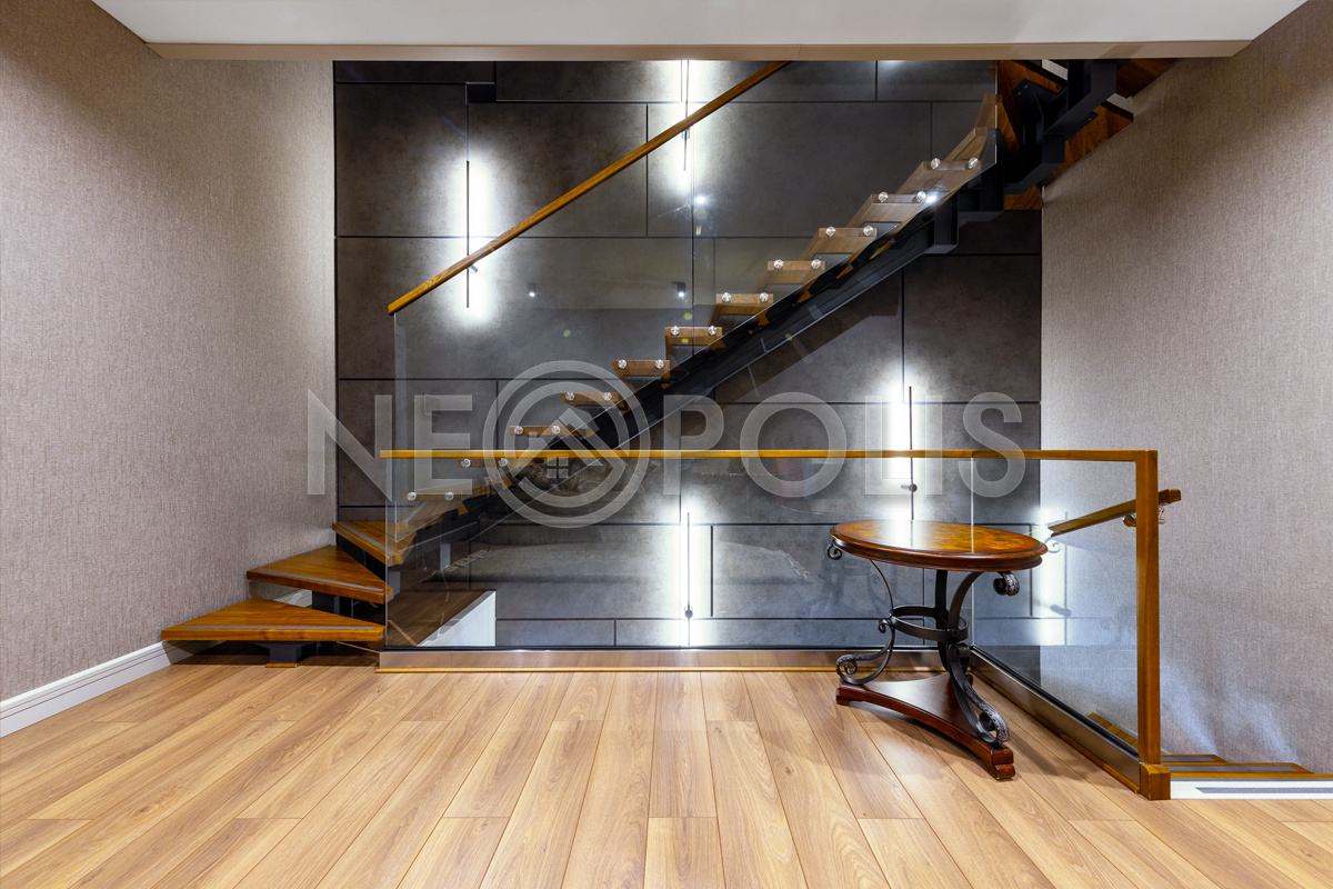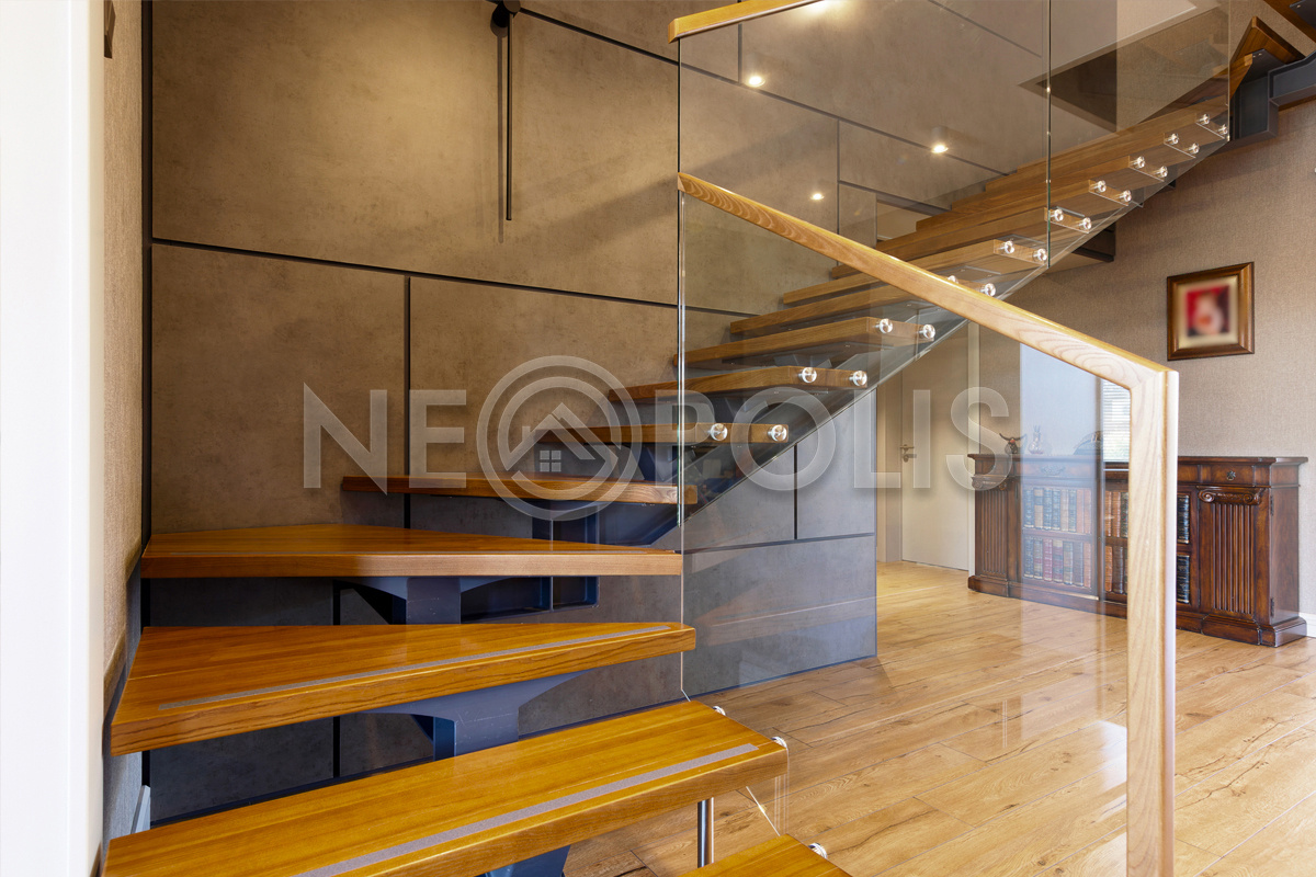 - Лестница: в стиле Loft на стальном основании: металл + стекло + дуб