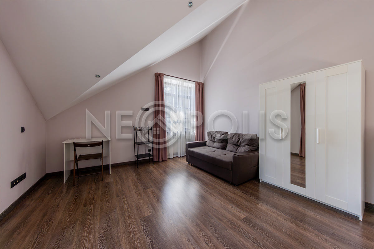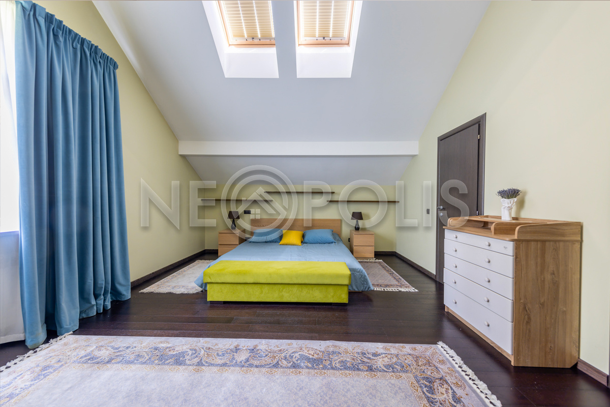 - 2 этаж:мастер-спальня со своей ванной, гардеробной комнатой и выходом на балкон, детская спальня со своей ванной комнатой и гардеробной, 2 спальни, санузел.