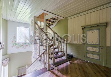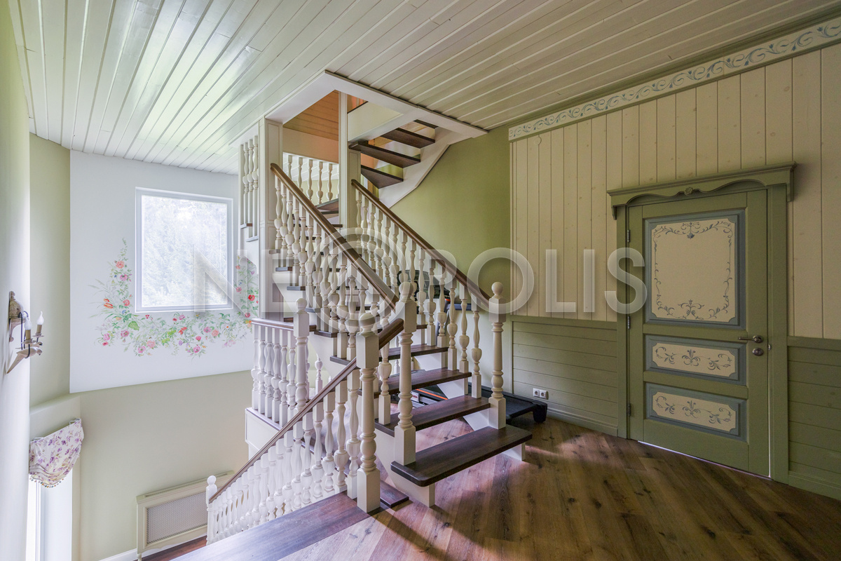 - Лестница: широкая, дубовая с белыми патинированными балясинами