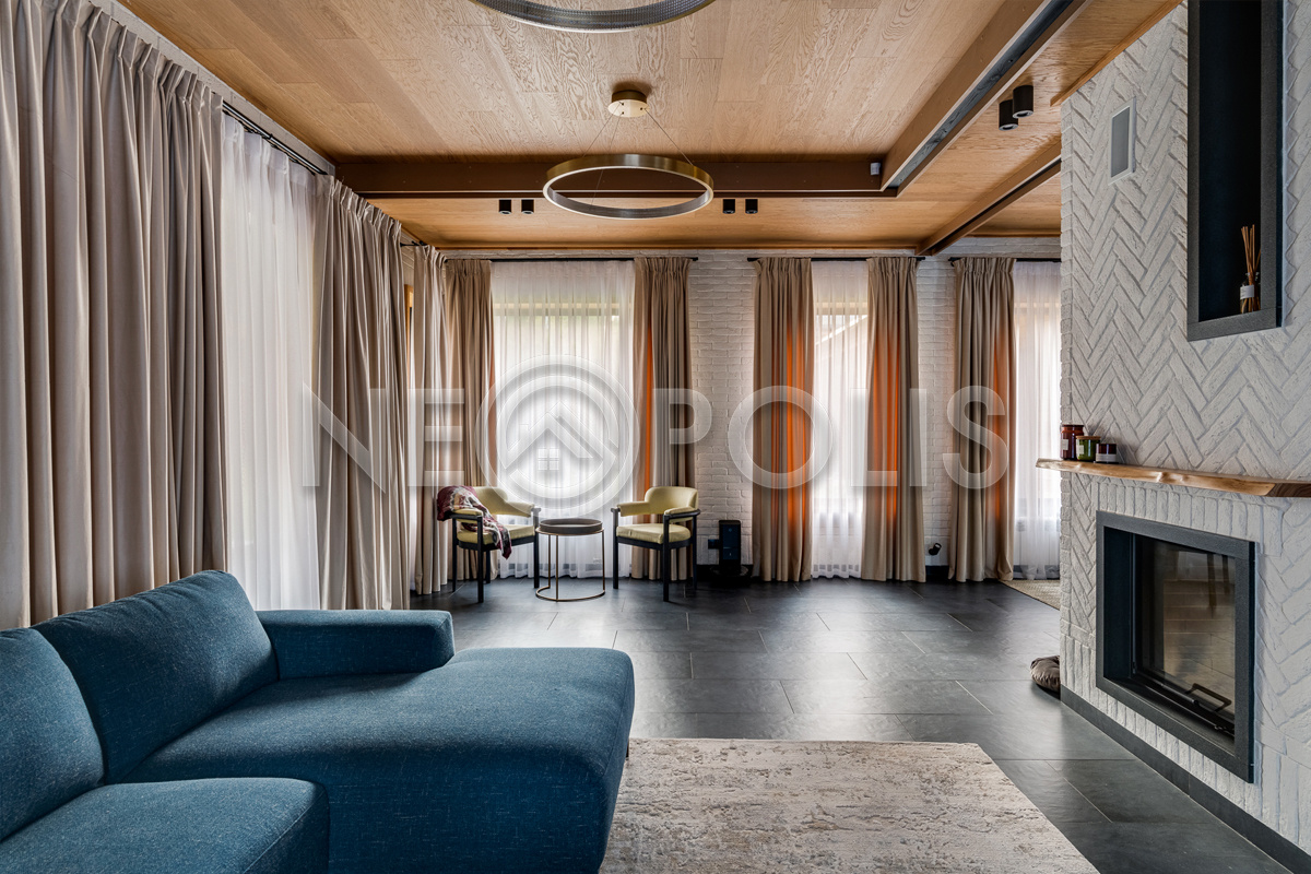 - 1 этаж:прихожая, гардеробная, кухня – столовая, гостиная с двусторонним камином и выходом на террасу, гостевая спальня с ванной комнатой, сауна, комната отдыха, душевая, санузел, постирочная, гараж на 2 авто, навес для садовой техники, котельная.