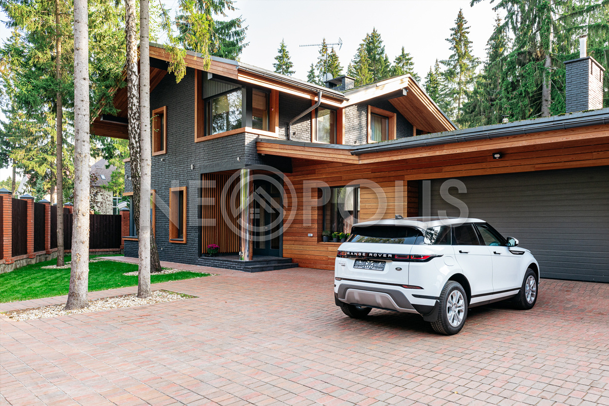 - Материал стен кирпич, фасад отделан камнем и лиственницей, внутренние стены отделаны деревом (лиственница), искусственным камнем, нержавеющей сталью и коллекционными обоями.