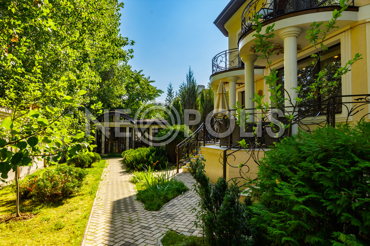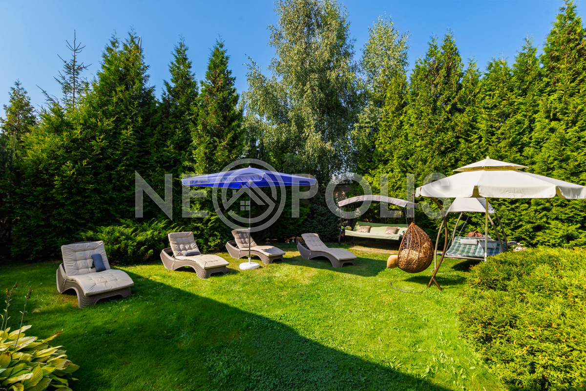 Просторный зеленый участок с ландшафтным дизайном.
