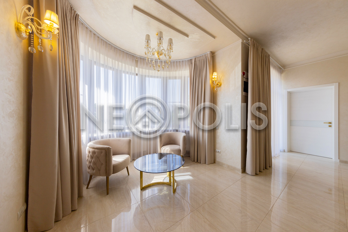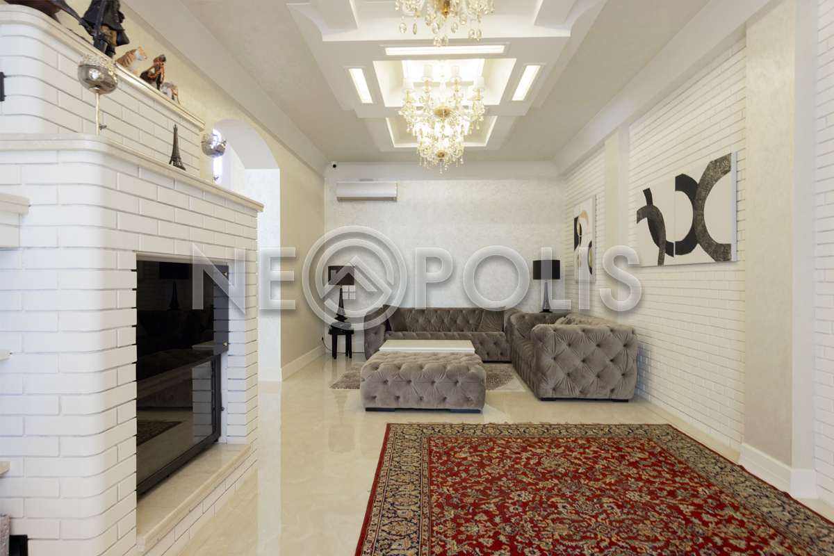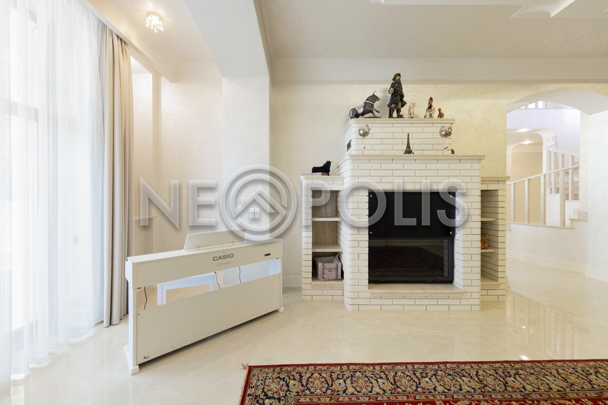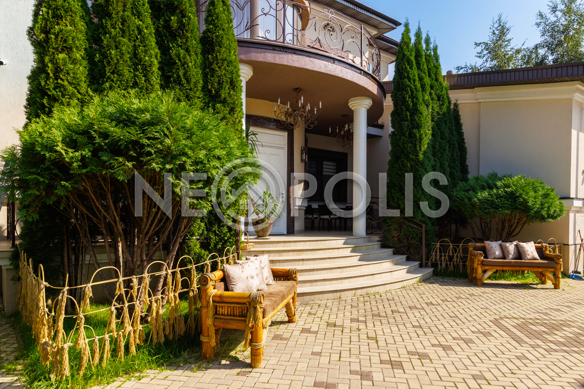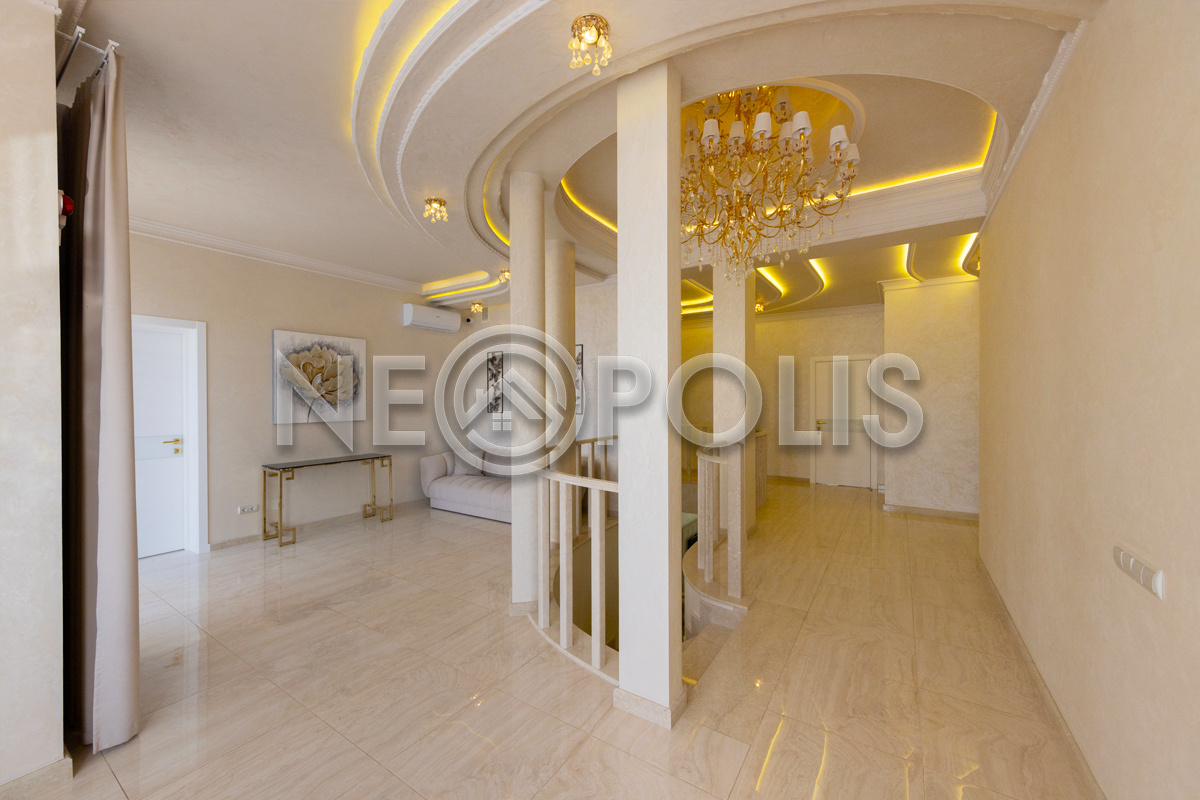 - 1 этаж:прихожая, холл, кухня-столовая с выходом на террасу, гостиная, каминный зал, гостевой блок с выходом на улицу (зона домашнего кинотеатра, две спальни, игровая, гардеробная, санузел); блок для персонала 80 кв.м. с отдельным входом со двора и собственным входом в дом (дополнительная кухня, гостиная, три спальни, прачечная и ванная комната), гараж на 3 авто с мойкой (оснащен всем техническим оборудованием).