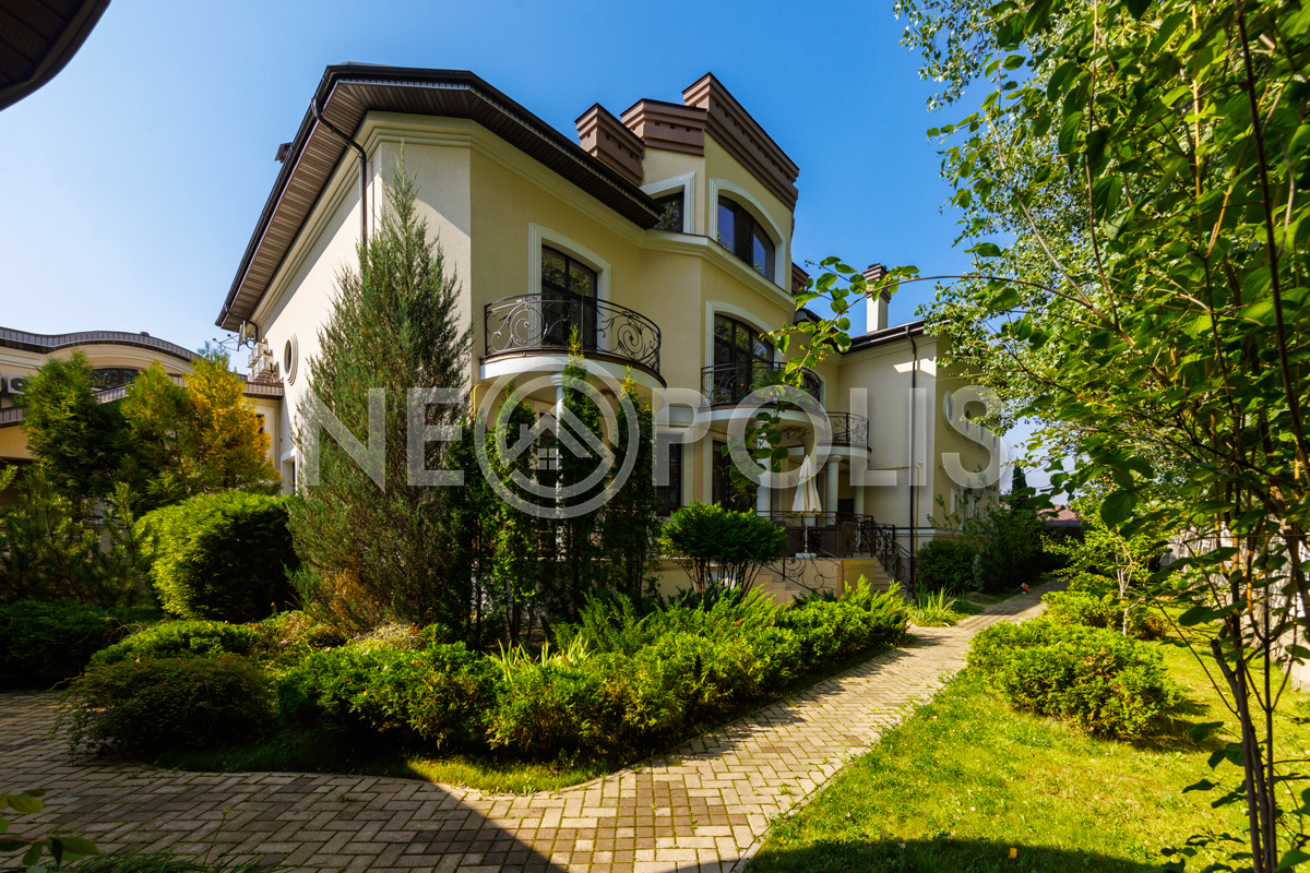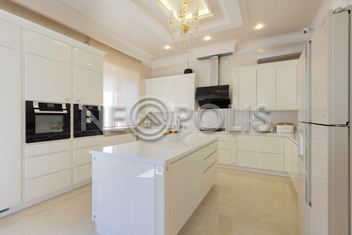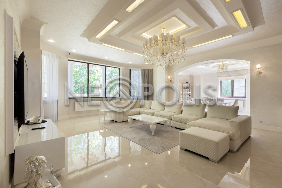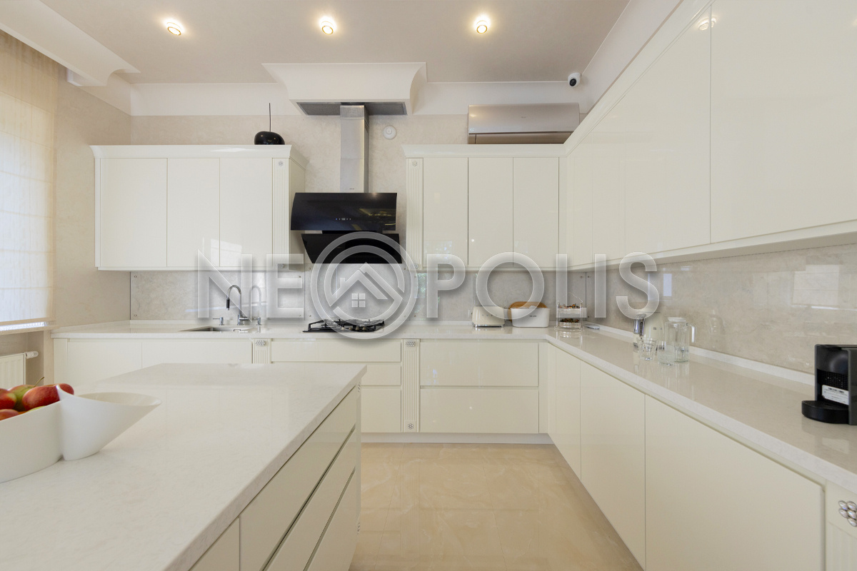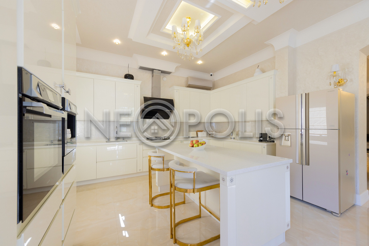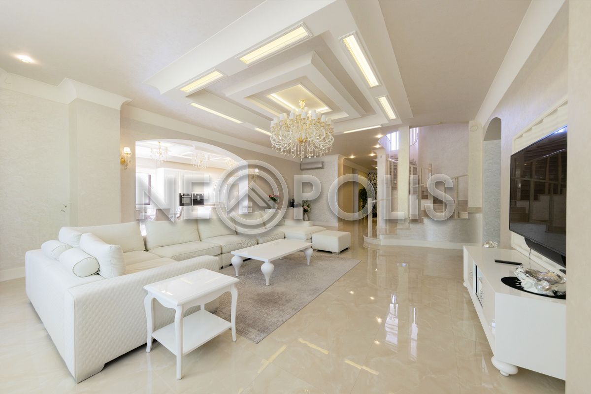 - 1 этаж:прихожая, холл, кухня-столовая с выходом на террасу, гостиная, каминный зал, гостевой блок с выходом на улицу (зона домашнего кинотеатра, две спальни, игровая, гардеробная, санузел); блок для персонала 80 кв.м. с отдельным входом со двора и собственным входом в дом (дополнительная кухня, гостиная, три спальни, прачечная и ванная комната), гараж на 3 авто с мойкой (оснащен всем техническим оборудованием).