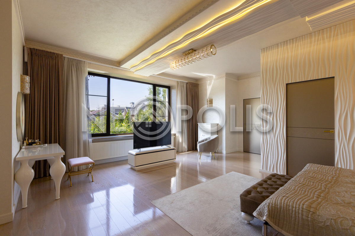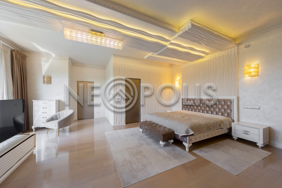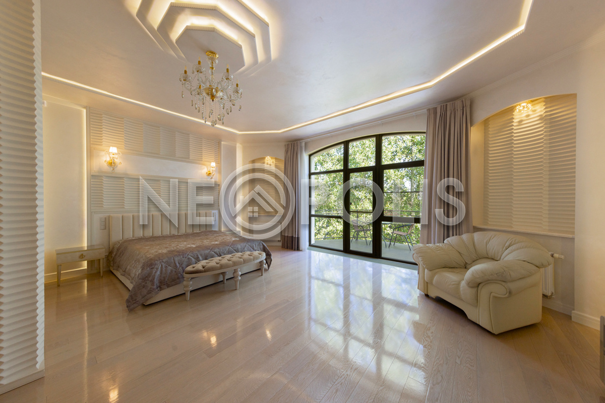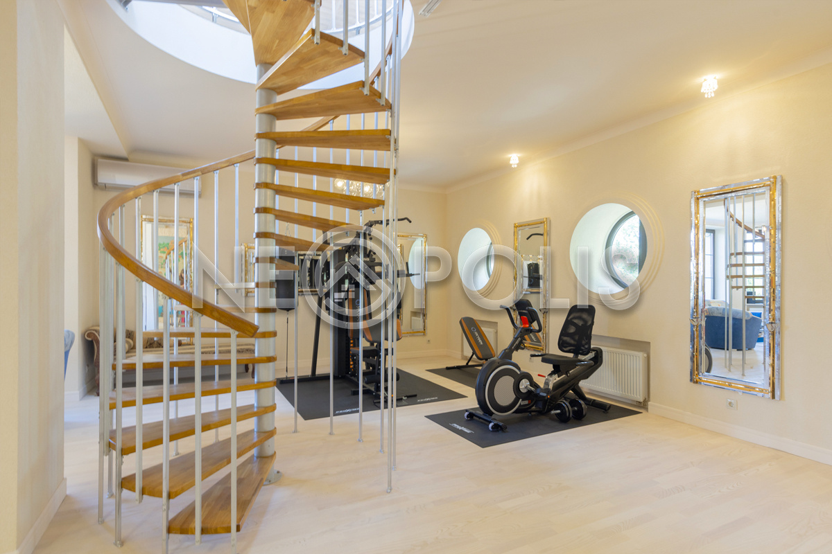 - 2 этаж:холл с выходом на веранду, мастер-спальня с гардеробной, ванной комнатой и балконом, 3 спальни с гардеробными, ванными комнатами и балконами, тренажерный зал с панорамным видом на сад.