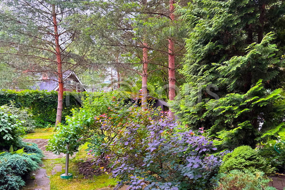 Зеленый участок со взрослыми хвойными и лиственными деревьями и кустарниками, облагорожены цветники.