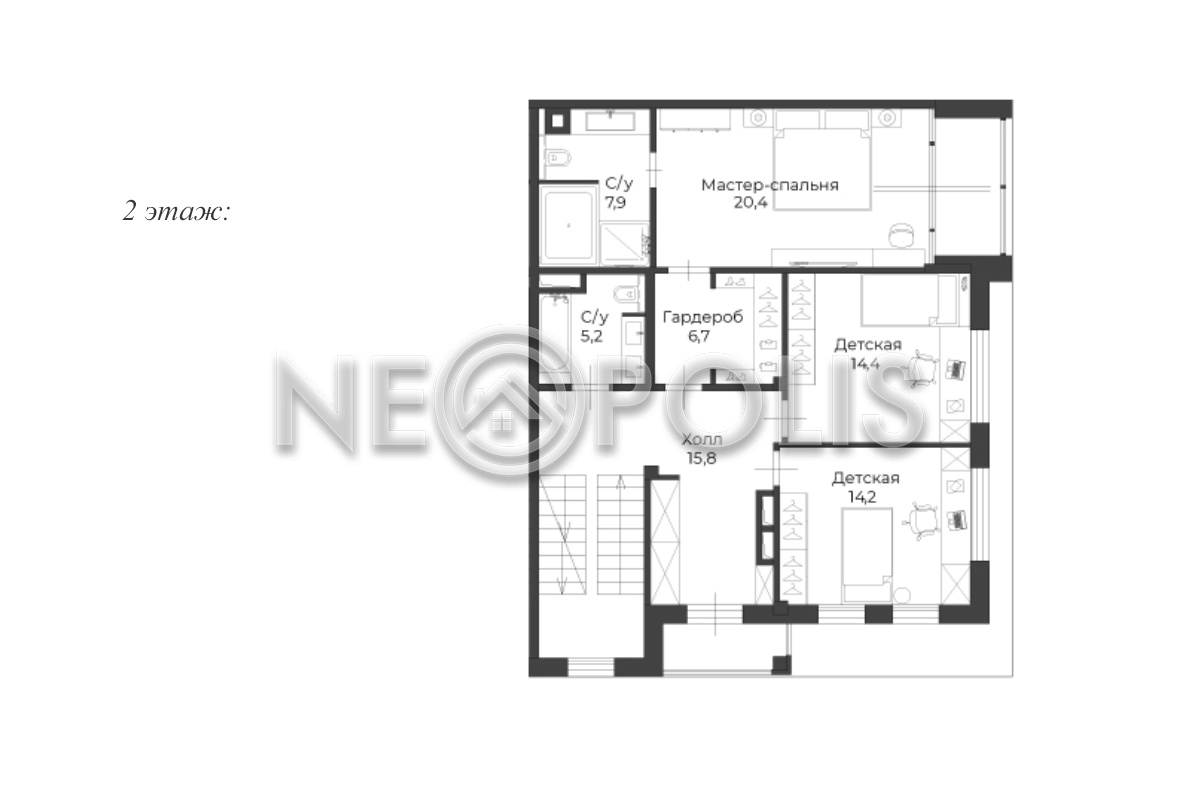 - 2 этаж:холл, мастер спальня с гардеробной и ванной комнатой, 2 спальни, санузел.