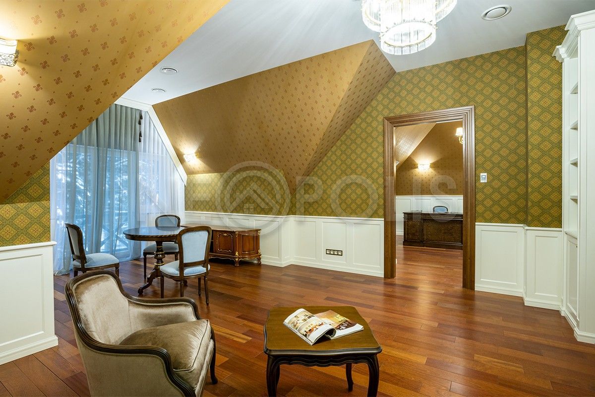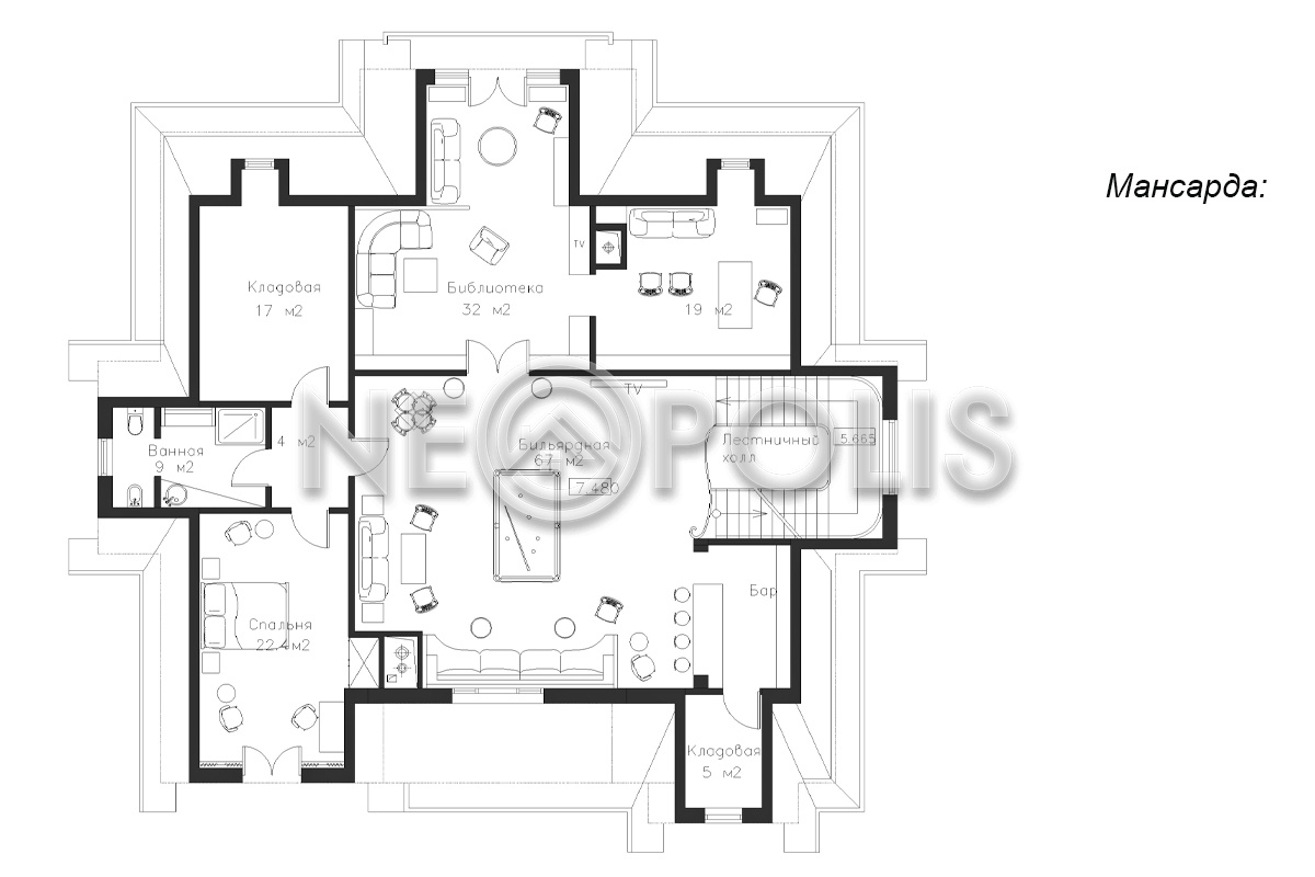 - Мансарда:спальня с гардеробной и ванной комнатой, библиотека, бильярдная, кладовая.