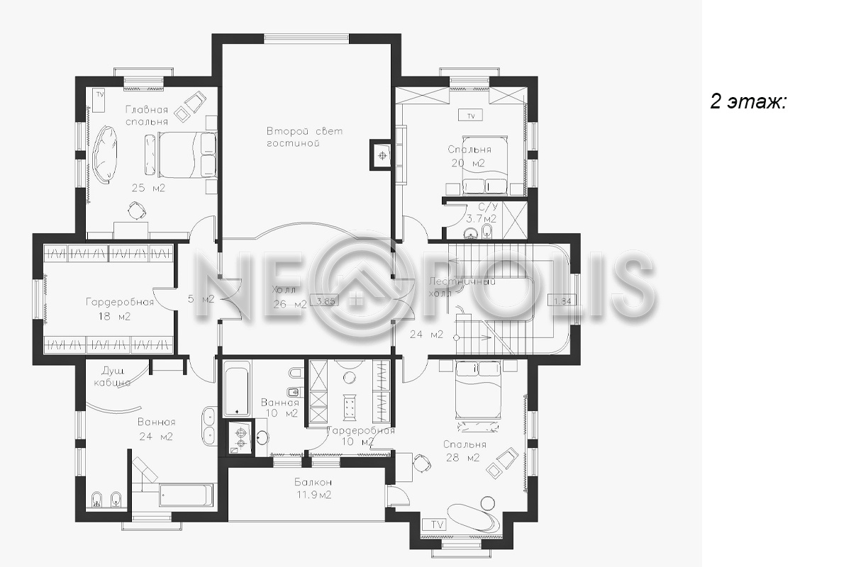 - 2 этаж:холл, 3 спальни с балконами, гардеробными и санузлами, второй свет.