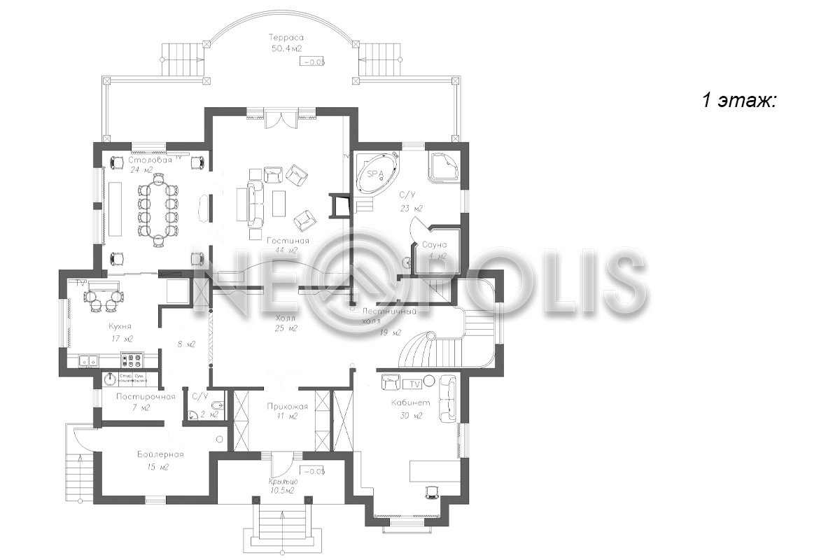 - 1 этаж:холл, гостиная с камином, столовая, кухня, кабинет, прачечная, санузел, котельная, зона SPA, просторная терраса на заднем дворе.