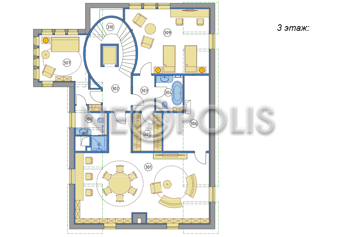- 3 этаж:холл, игровая, 2 детские спальни с гардеробными и ванными комнатами.