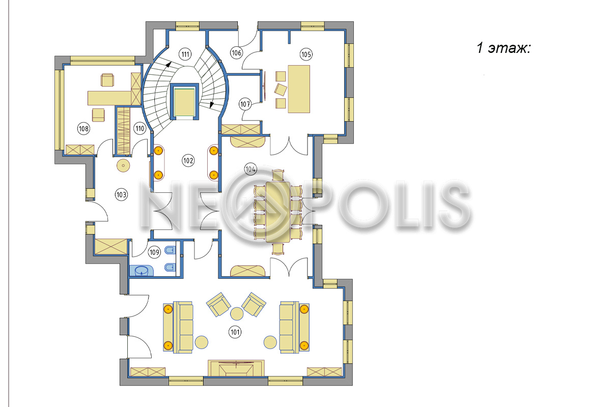 - 1 этаж:прихожая, лестничный холл, кухня, столовая с выходом во двор, гостиная с камином и выходом на террасу, кабинет, гардеробная, санузел.