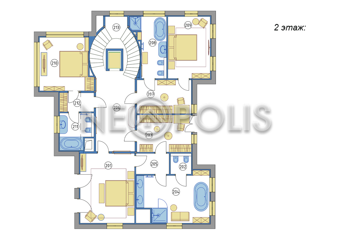 - 2 этаж:лестничный холл, мастер спальня с гардеробной и ванной комнатой, 2 спальни с гардеробными и ванными комнатами.