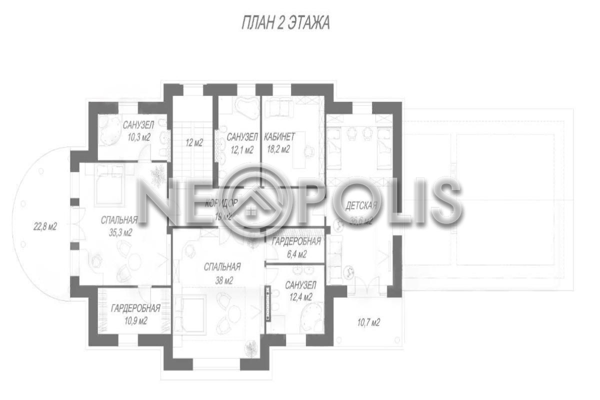 - 2 этаж:холл, мастер спальня с гардеробной, ванной комнатой и балконом, спальня с гардеробной и ванной комнатой, детская, кабинет, санузел.