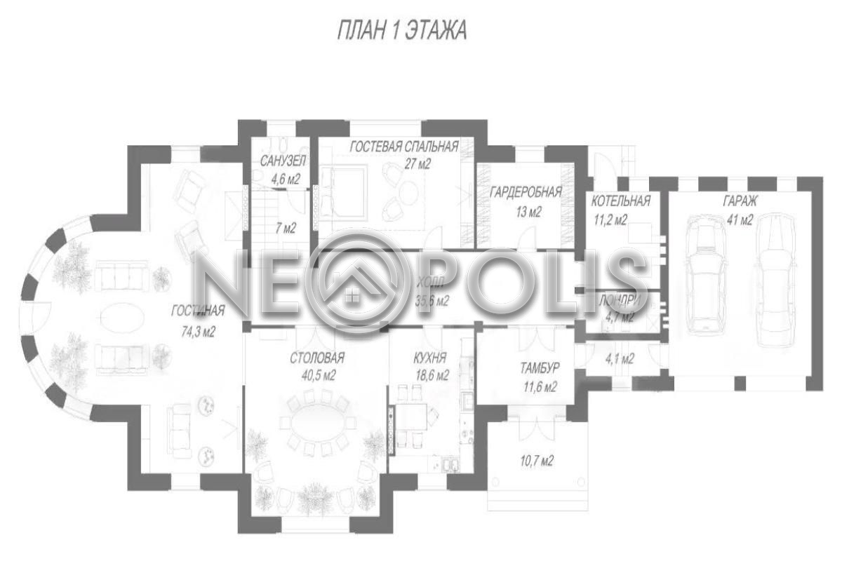 - 1 этаж:тамбур, холл, кухня-столовая, гостиная, спальня, гардеробная, санузел, постирочная, котельная, гараж на 2 авто.