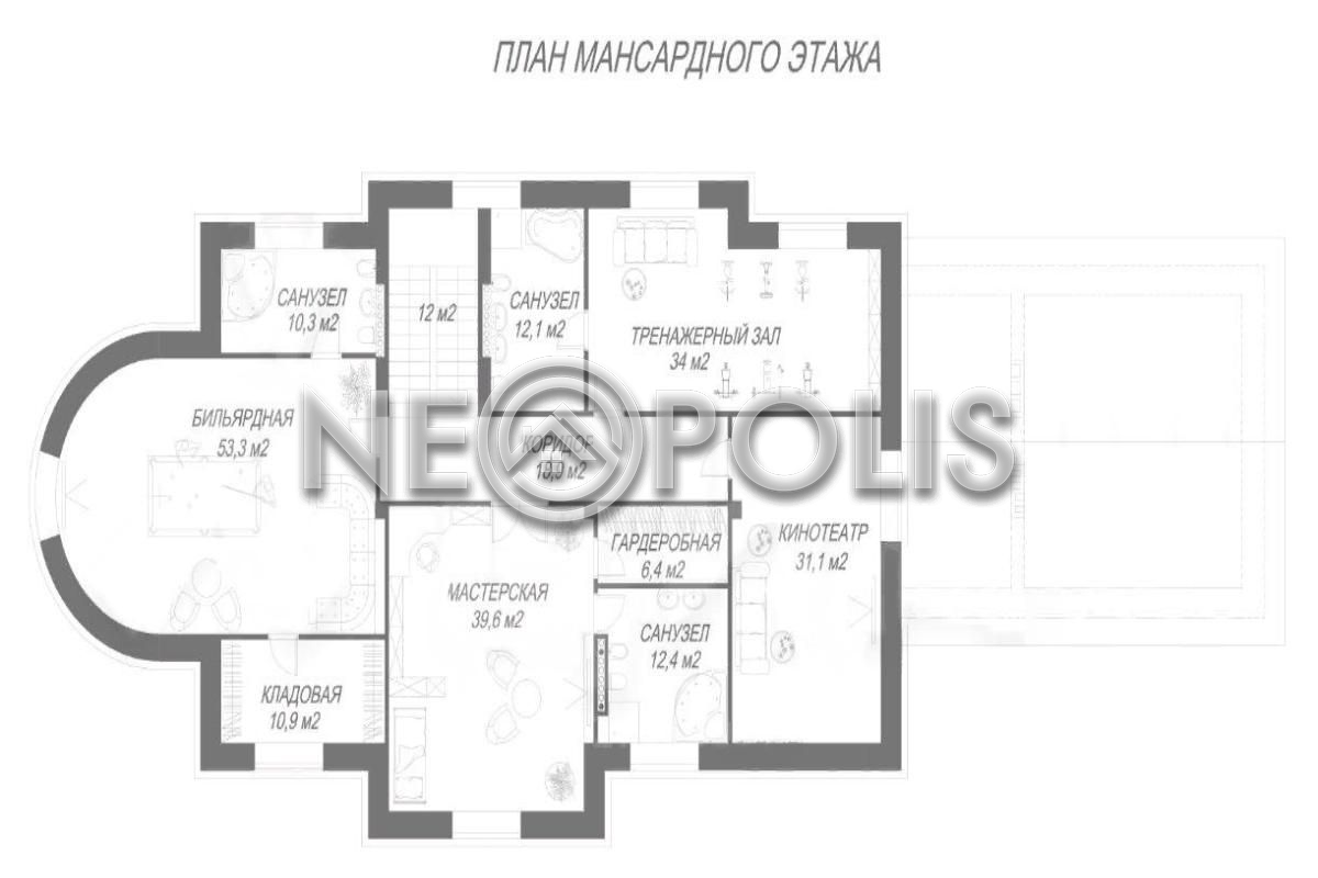 - Мансарда:мастерская с гардеробной и ванной комнатой, бильярдная с кладовой и ванной комнатой, зона домашнего кинотеатра, тренажерный зал, санузел.