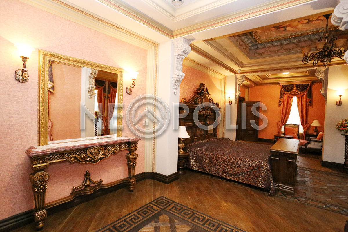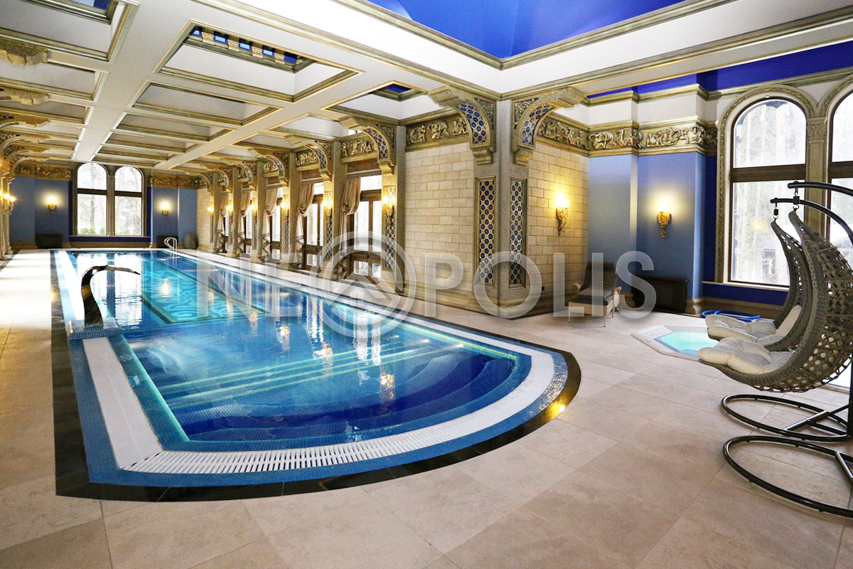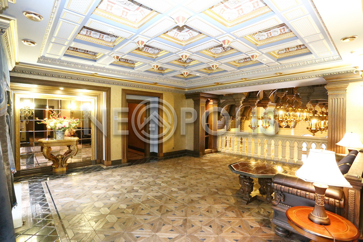 - 1 этаж:холл, малая гостиная, кухня, парадная столовая, салон, кабинет-зимний сад, винный погреб, бильярдная, туалетная комната, гардеробная, гостевая спальня, 4 санузла, кладовая, щитовая, техническое помещение, тренажерный зал, бассейн, сауна, хамам, душевая, холодная гардеробная, котельная.