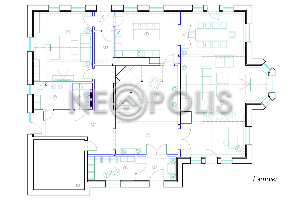 - 1 этаж:прихожая, холл, коридор, кухня, столовая, гостиная, кабинет, гардеробная, подсобное помещение, санузел, прачечная.