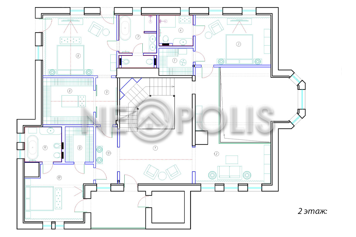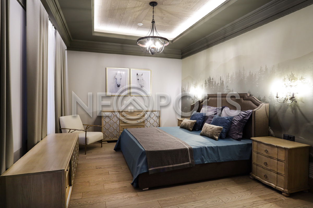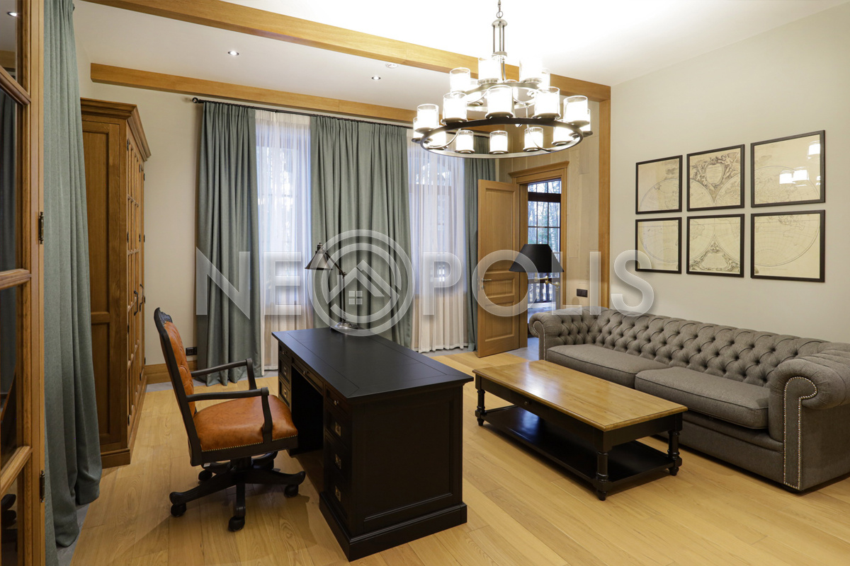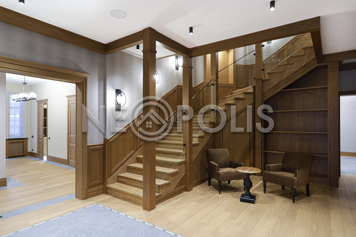 - 2 этаж:холл, мастер блок: спальня с гардеробной и ванной комнатой, 2 спальни с гардеробными и ванными комнатами, библиотека.