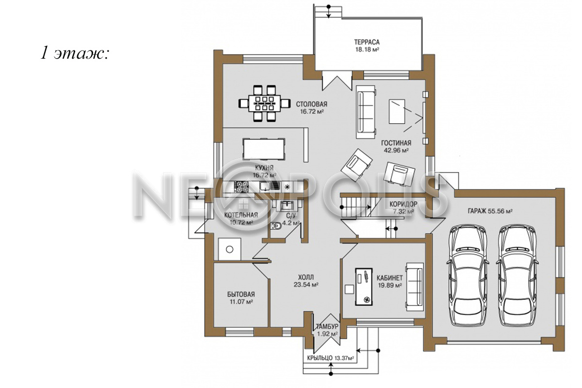 - 1 этаж:прихожая, холл, кухня-столовая, гостиная с выходом на просторную террасу, кабинет, санузел, котельная с отдельным входом, гараж на 2 авто.
