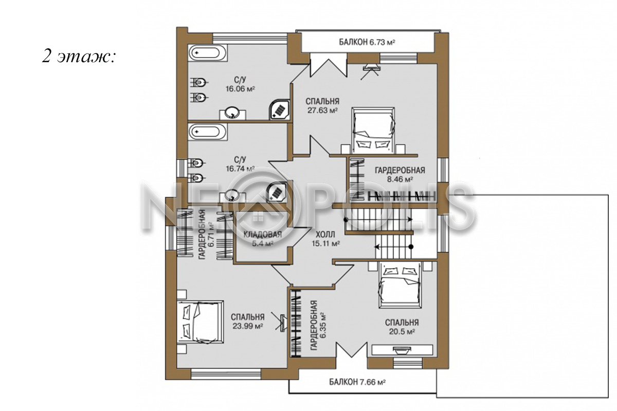 - 2 этаж:холл, мастер спальня с гардеробной, ванной комнатой и выходом на балкон, 2 спальни с гардеробными, санузел, кладовая.