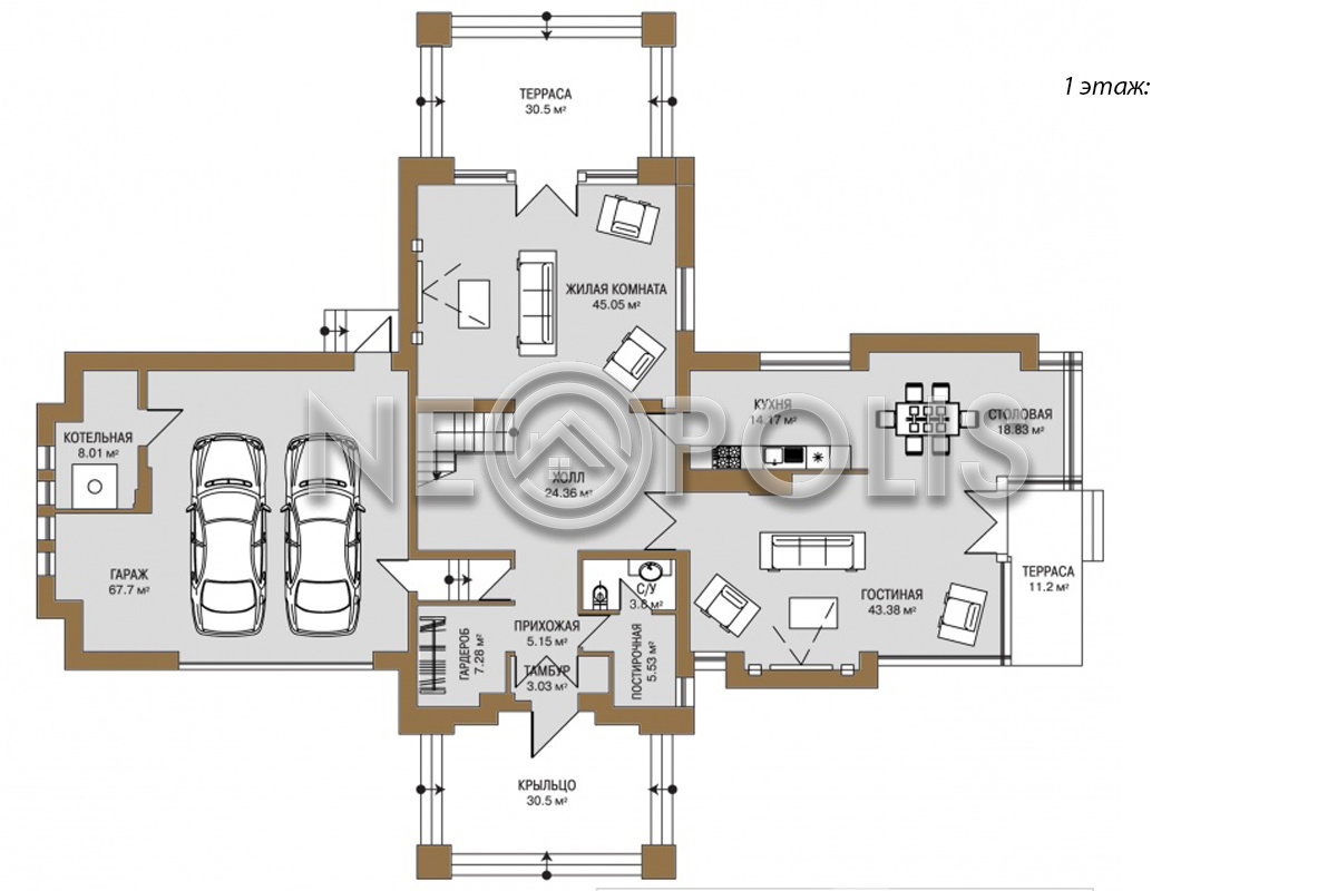 - 1 этаж:крыльцо, тамбур, прихожая с гардеробной, холл, кухня-столовая, гостиная с выходом на просторную террасу, жилая комната с выходом на террасу, постирочная, гараж на 2 авто с котельной.