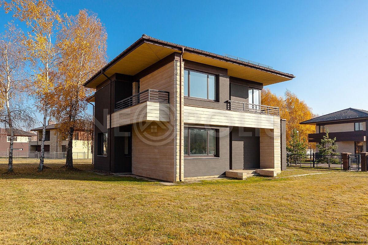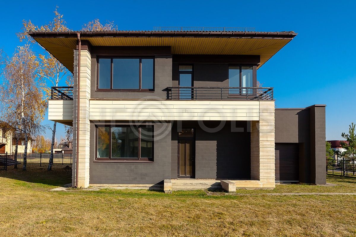 - Материал стен керамический кирпич RAUF, фасады облицованы декоративной светло-бежевой и темно–шоколадной плиткой в сочетании с фасадной доской