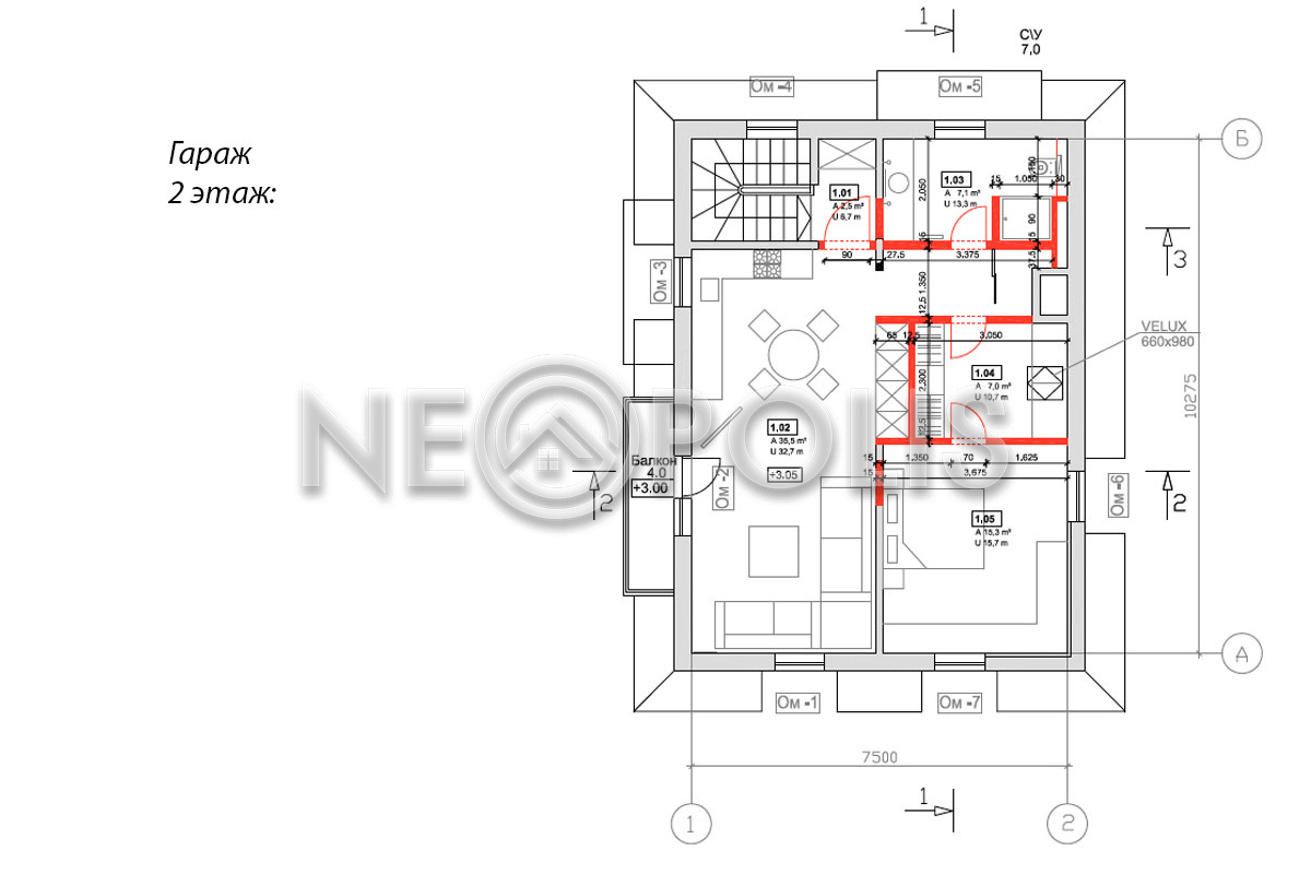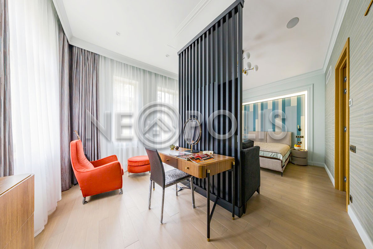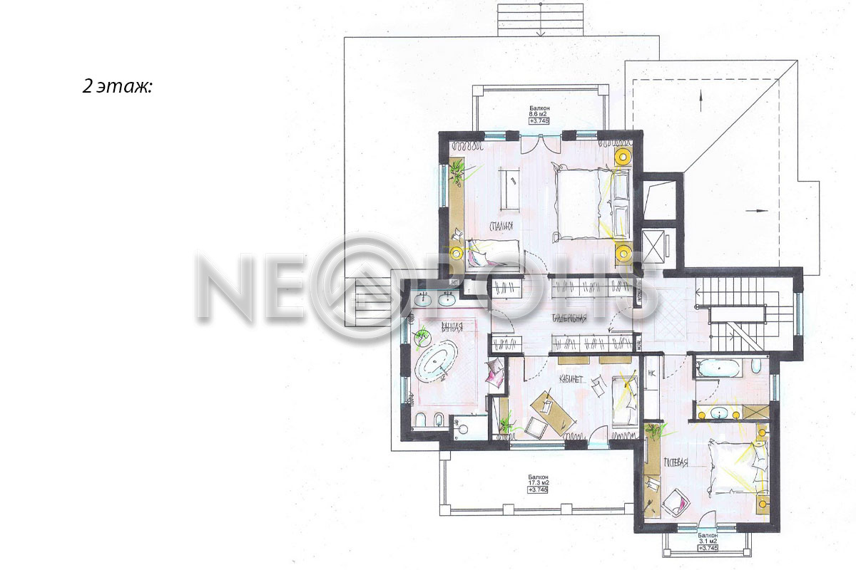 - 2 этаж:холл, мастер блок: спальня с балконом, гардеробная, кабинет с балконом. ванная комната; спальня, санузел.