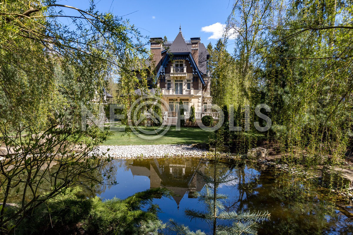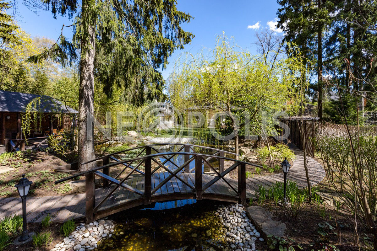 Роскошный зеленый участок с водоемом.