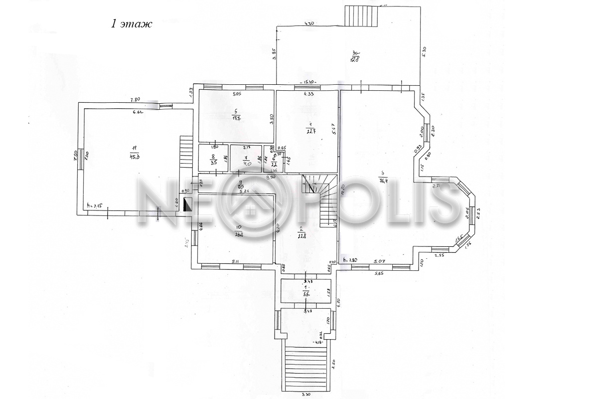 - 1 этаж:прихожая, холл, столовая с малым эркером и выходом на террасу и сад, каминный зал с большим эркером, кабинет, детская, санузел, коридор с выходом в гараж на 2 авто.