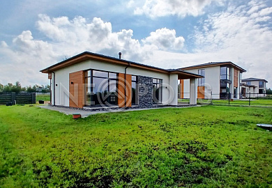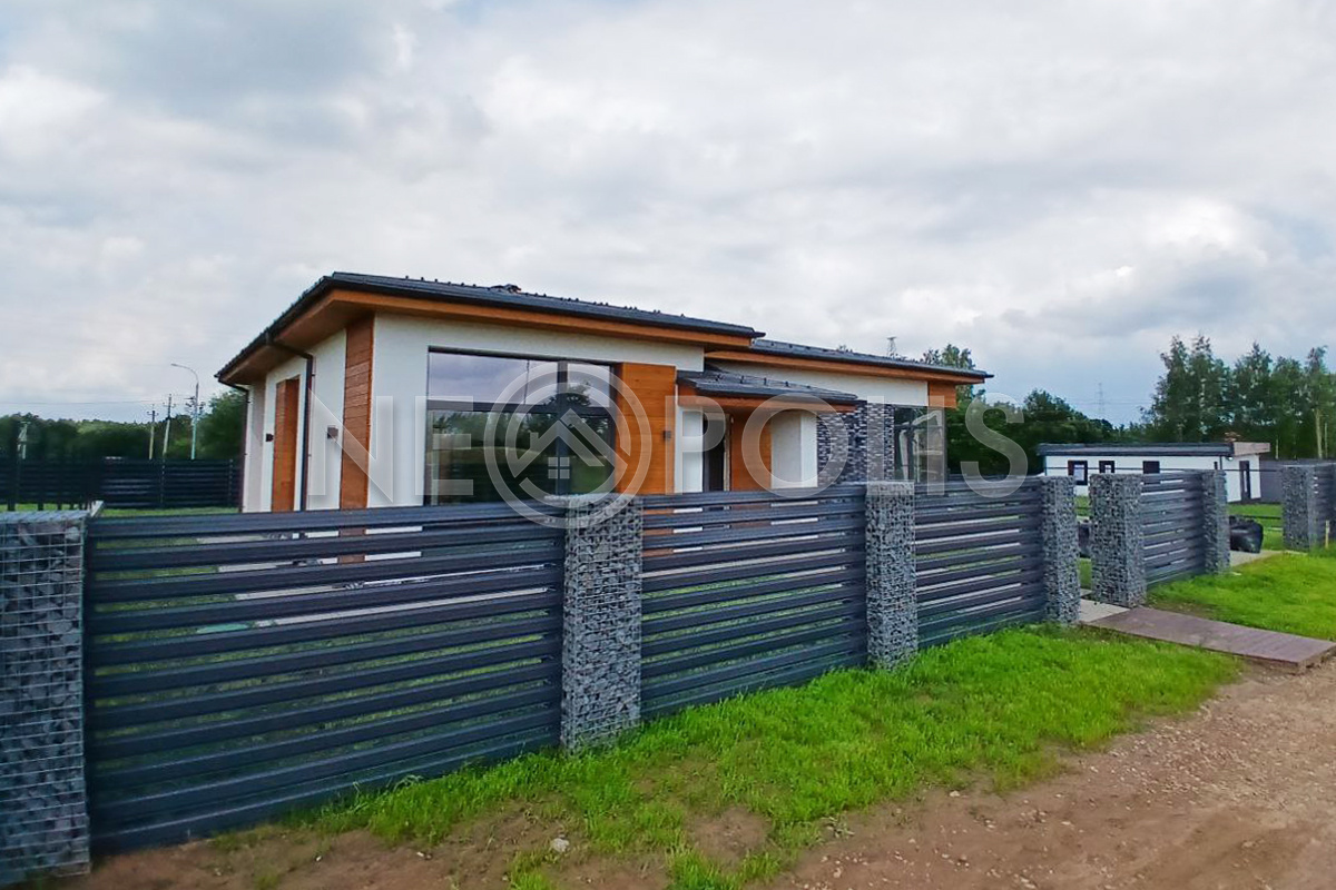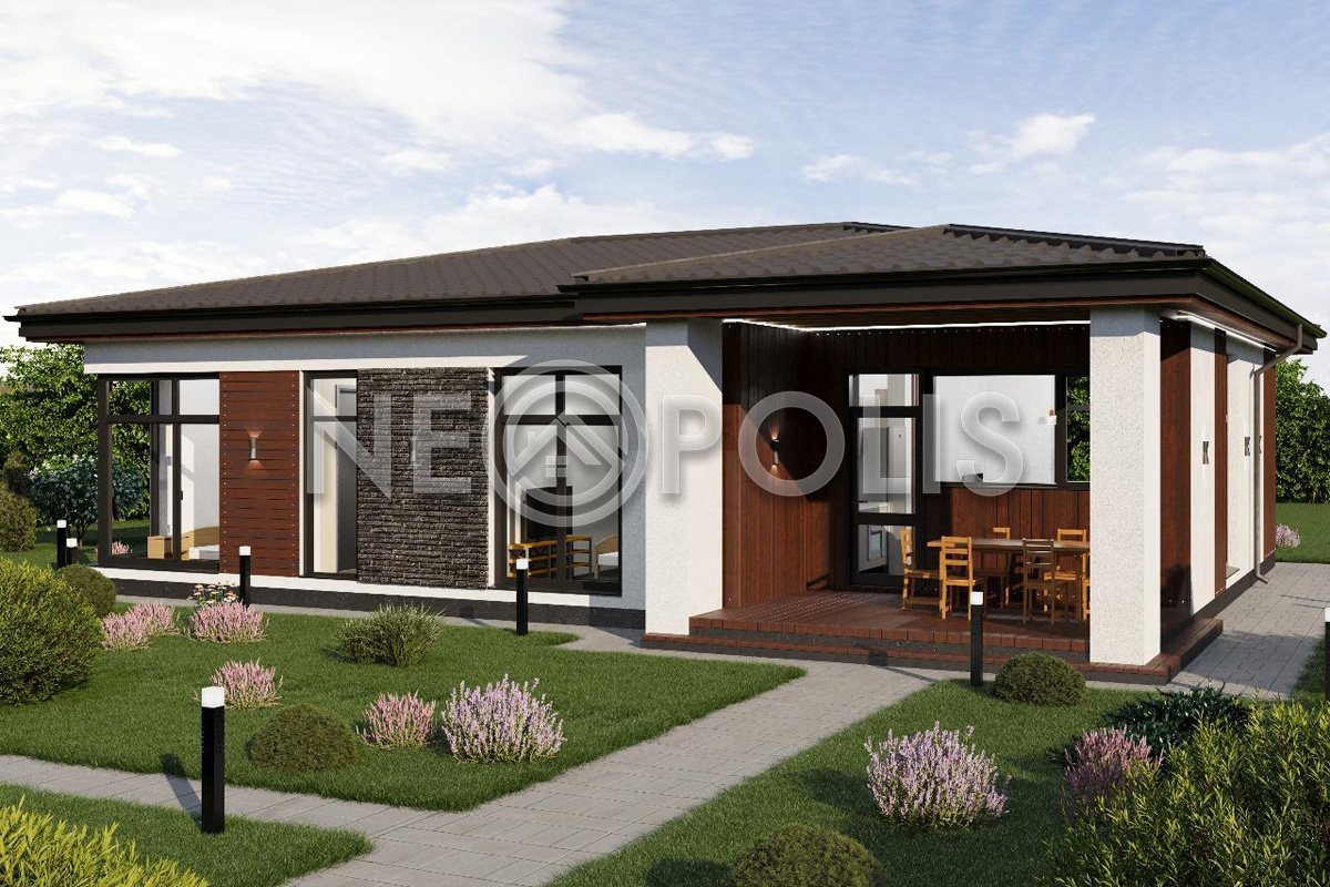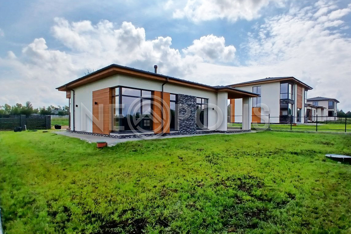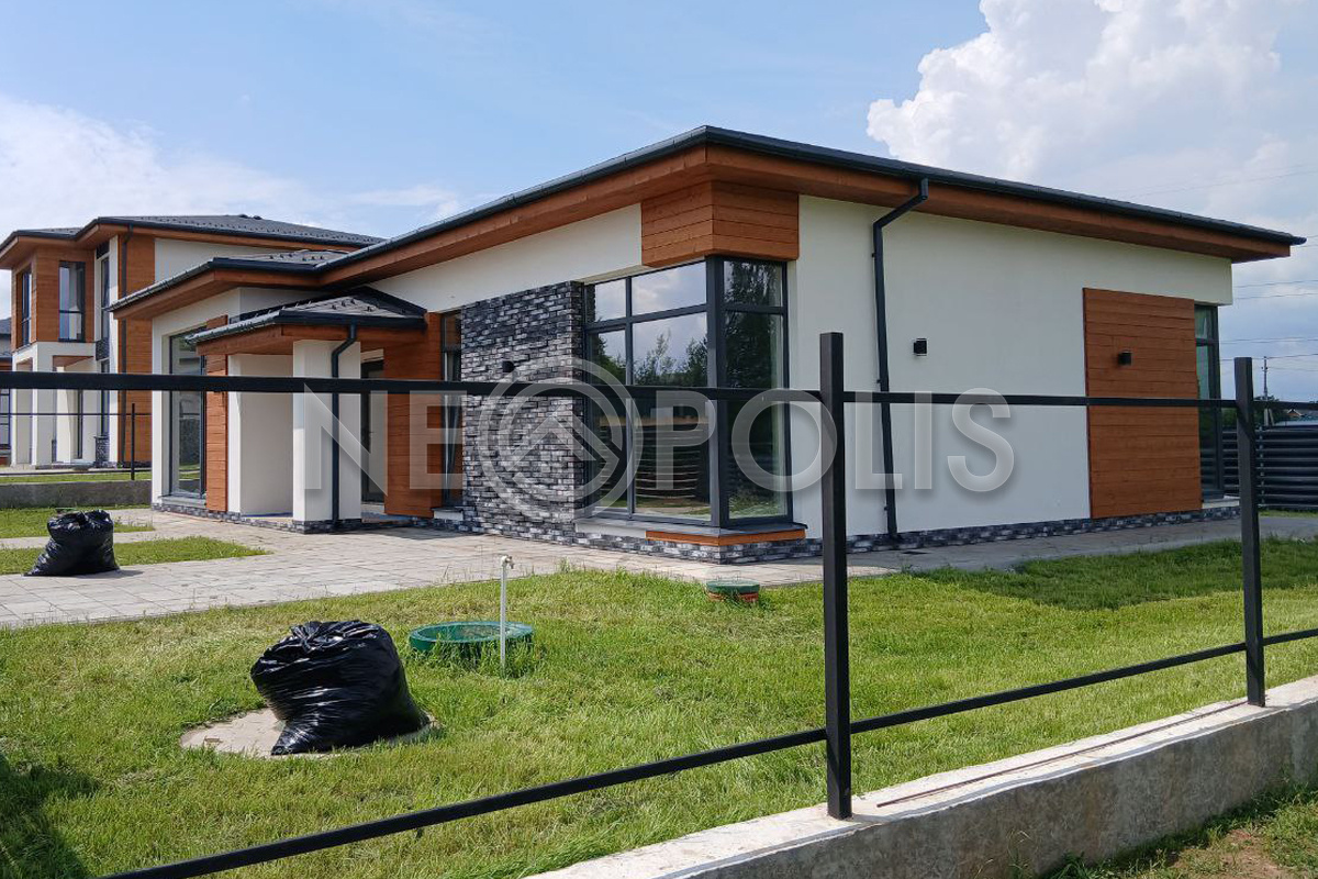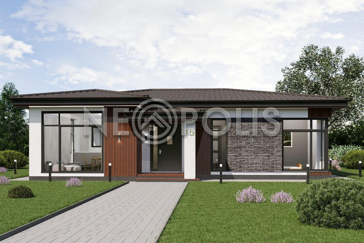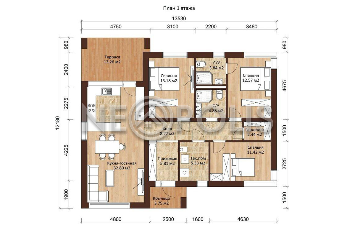 - 1 этаж:крыльцо, прихожая с зоной хранения, холл, кухня-столовая с выходом на террасу (13,26 кв.м.), гостиная, спальня с ванной комнатой, две спальни, санузел, гардеобная, техническое помещение.
