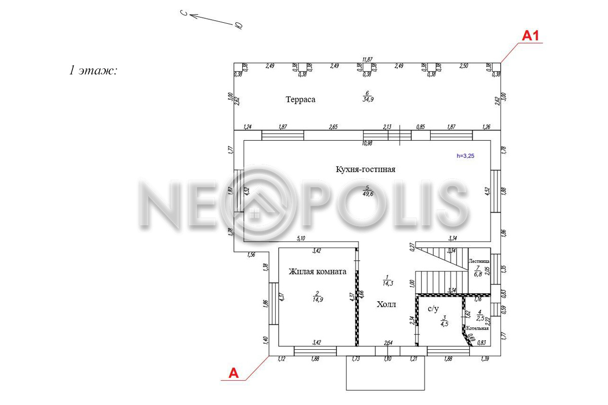- 1 этаж:холл, кухня-столовая, гостиная с выходом на террасу, спальня/кабинет, санузел, котельная.