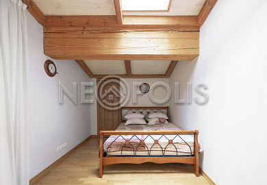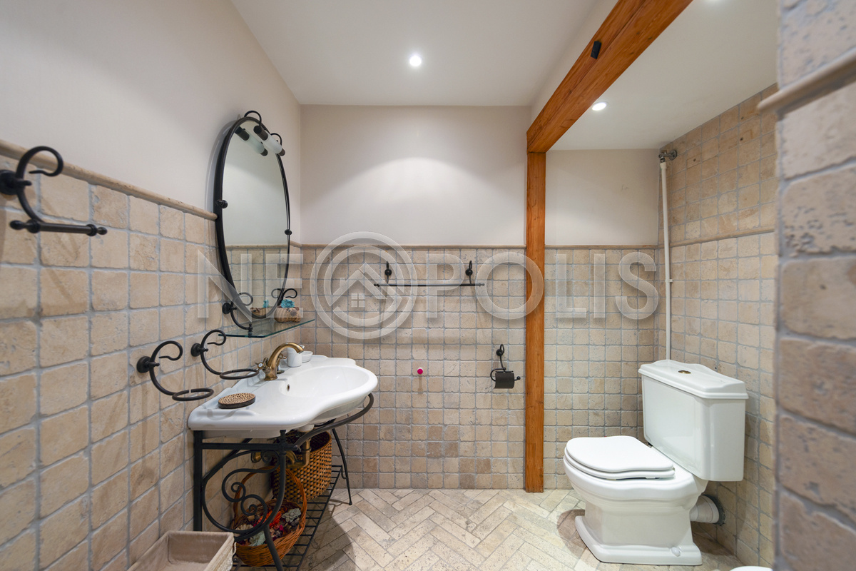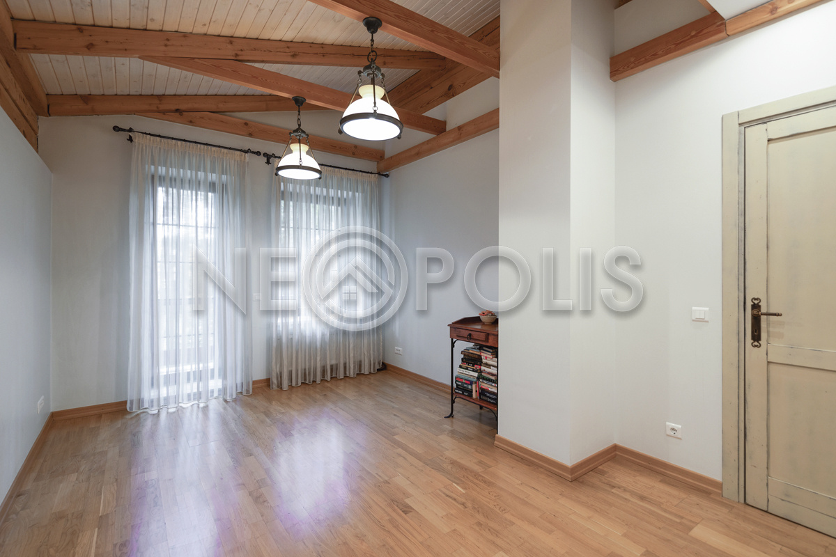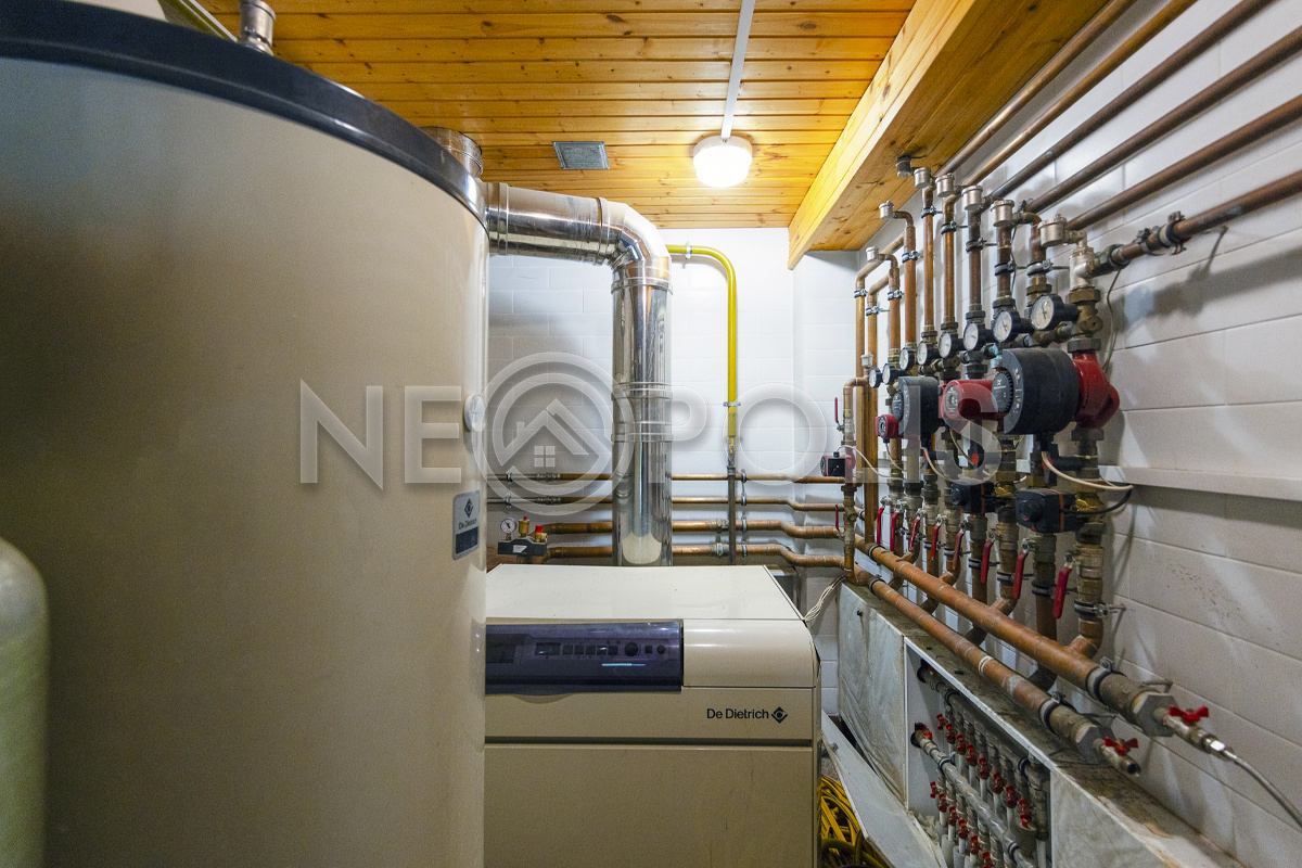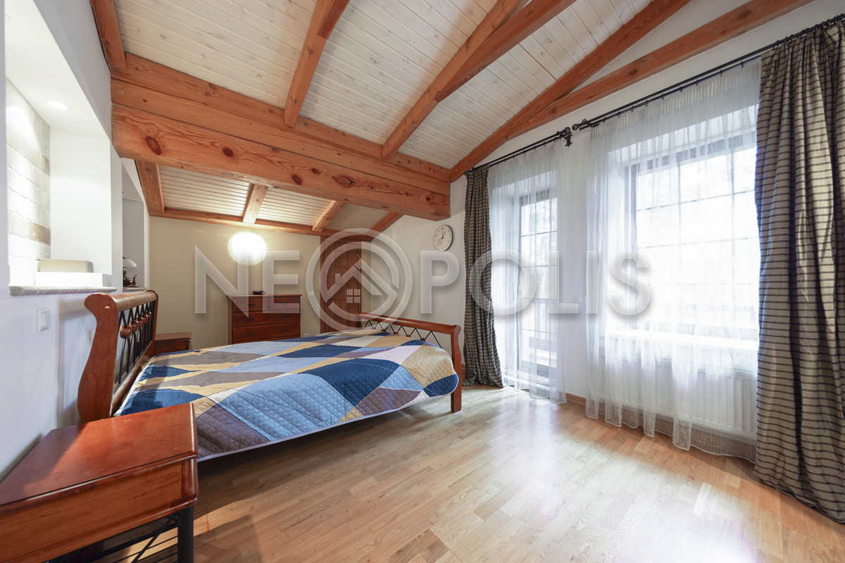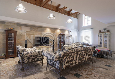 - 1 этаж:тамбур, холл, кухня-столовая с выходом на террасу (108.6 кв.м.), гостиная со вторым светом и дровяным камином, две спальни, санузел, прачечная, котельная с отдельным входом с улицы.