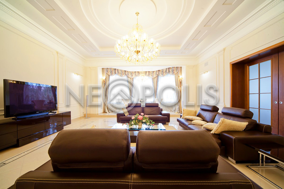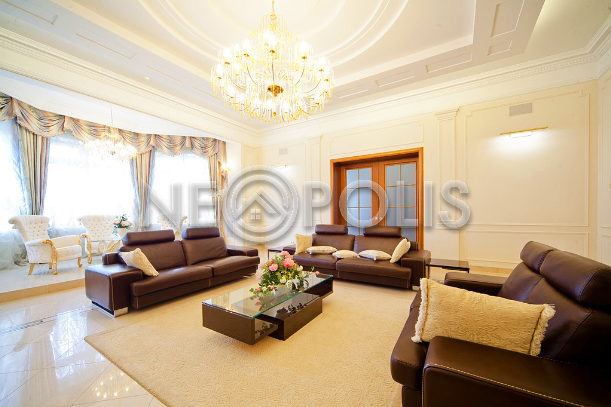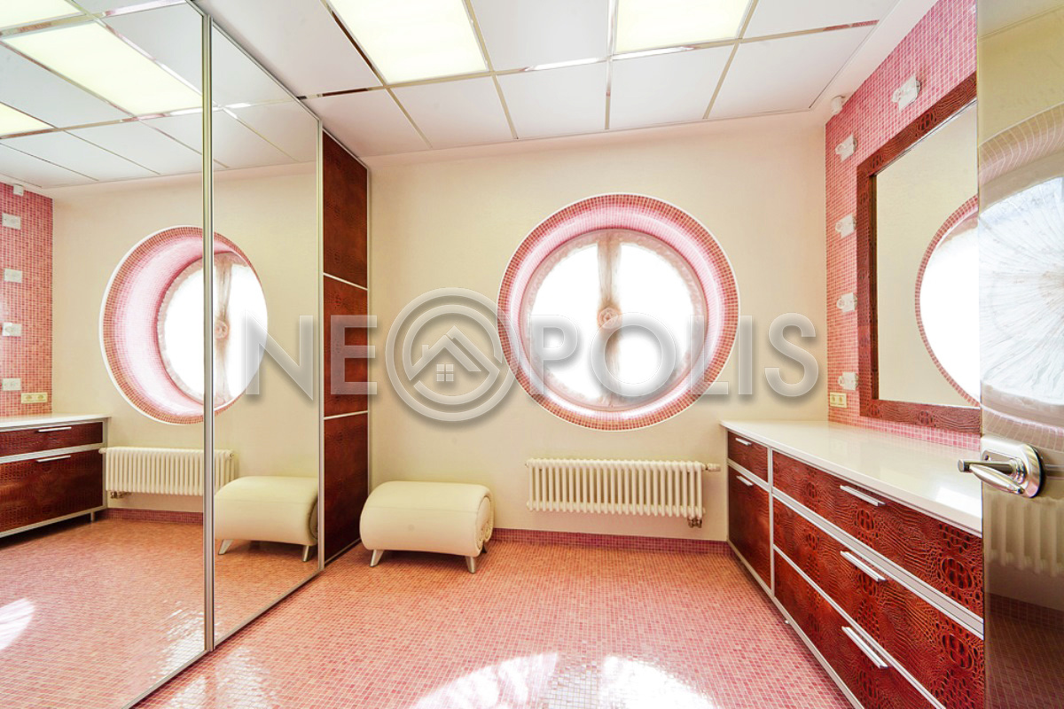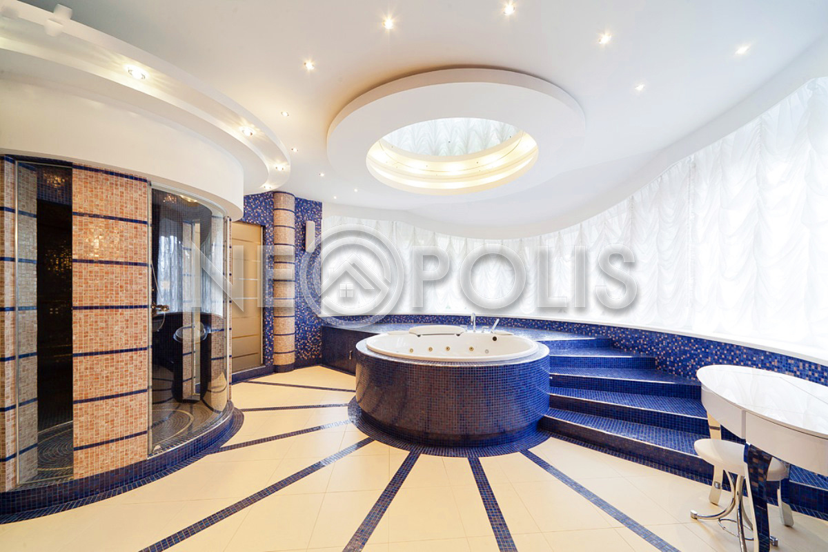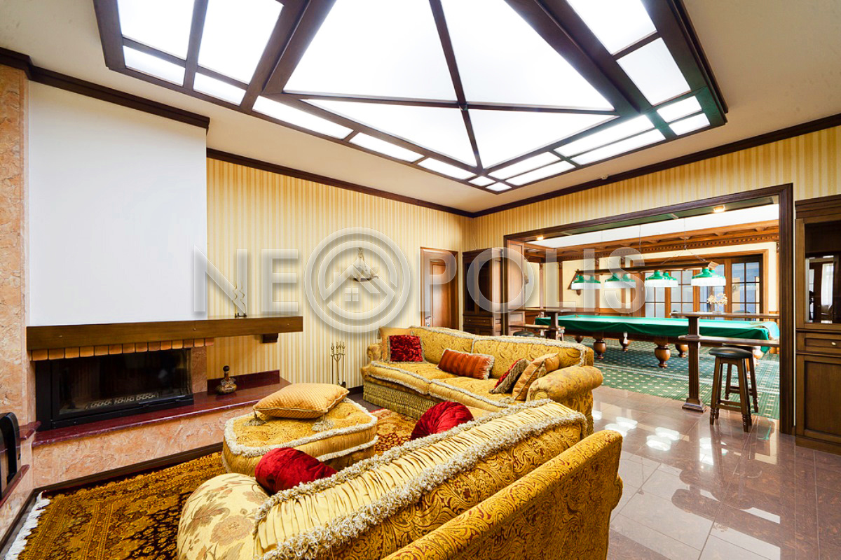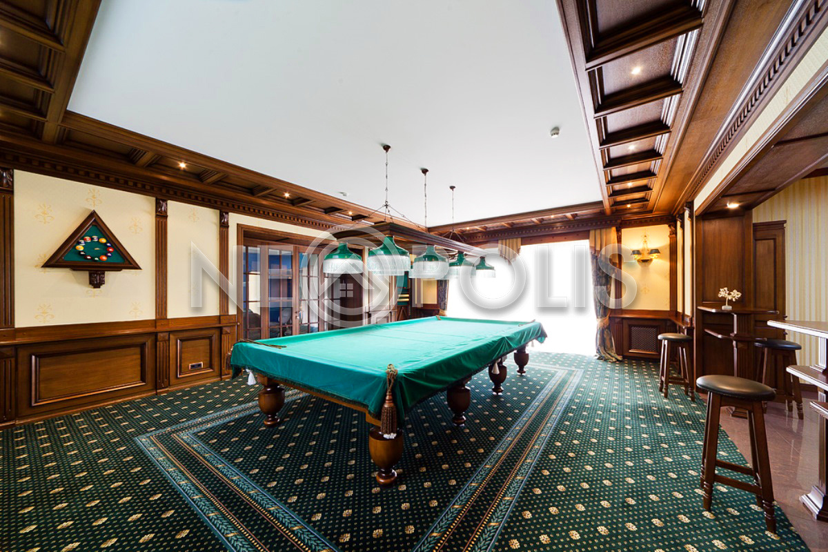 - 1 этаж:холл с парадной лестницей, лифтом, гардеробной и выходом в сад, кухня-столовая, каминный зал, гостиная, кабинет, бильярдная с выходом в сад, SPA зона: хамам, финская сауна, раздевалка, санузел с душевыми; постирочная, бойлерная, гараж на 3 авто с квартирой для персонала на втором этаже (с отдельным входом).