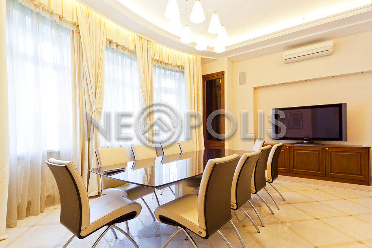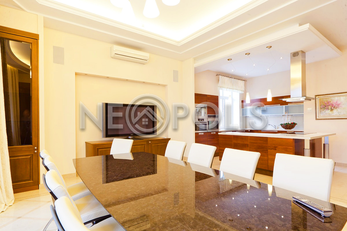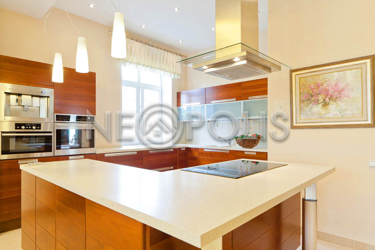 - Мебель: кухня из массива ценных пород дерева со столешницей из цельного камня, встроенная техника