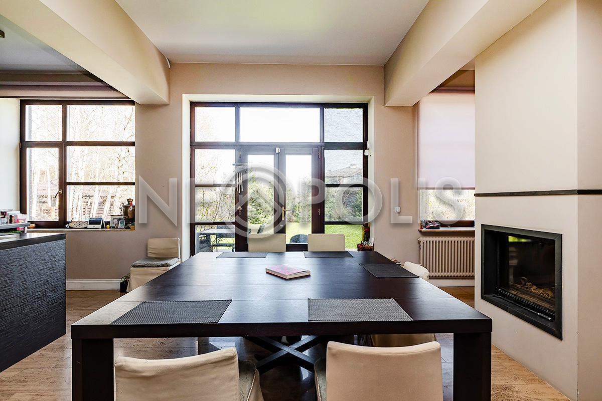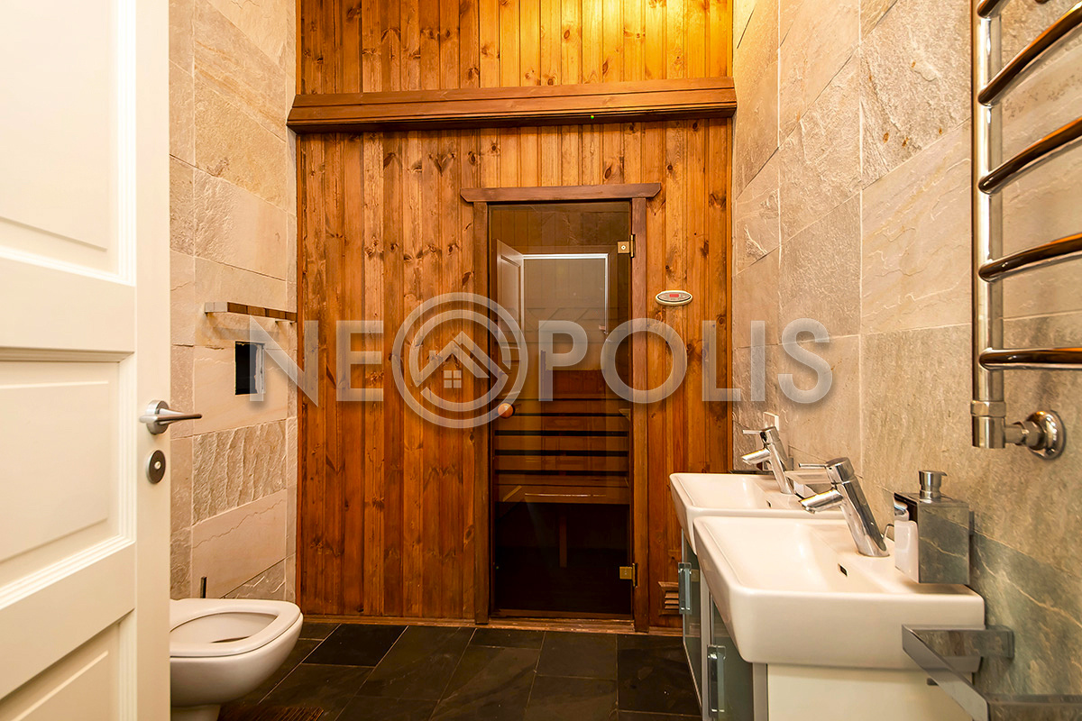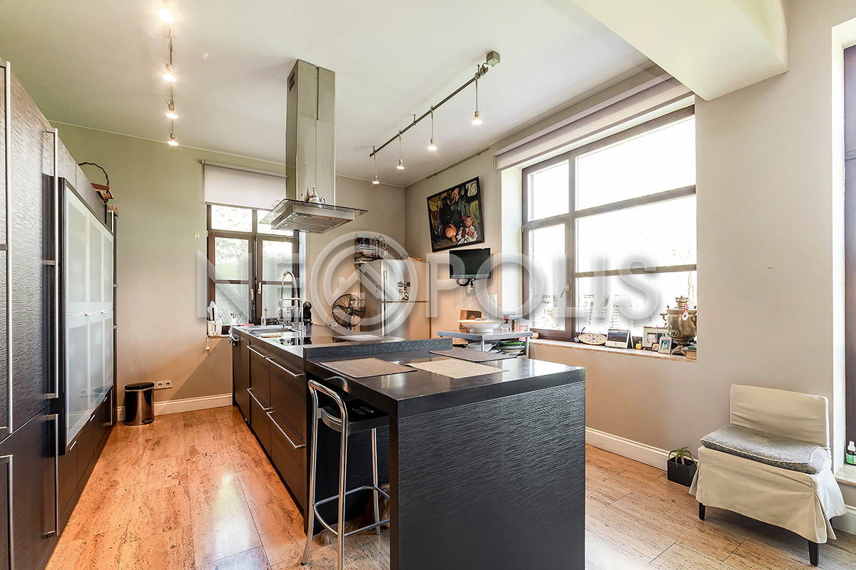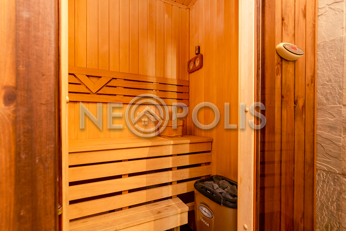 - Мебель: кухонный гарнитур марки Leicht, техника AEG и Kuppersbusch, столешница из натурального черного гранита, двусторонний камин марки Fabrilor, сауна Harvia