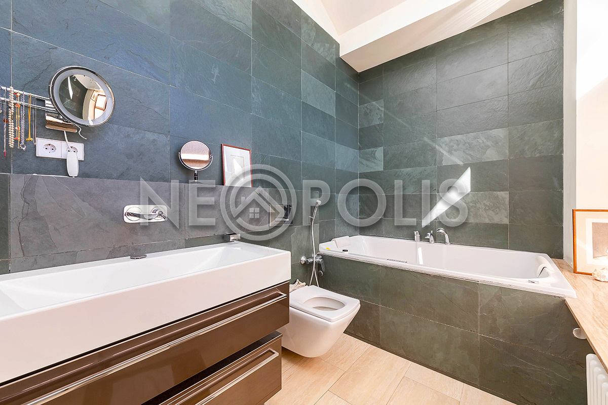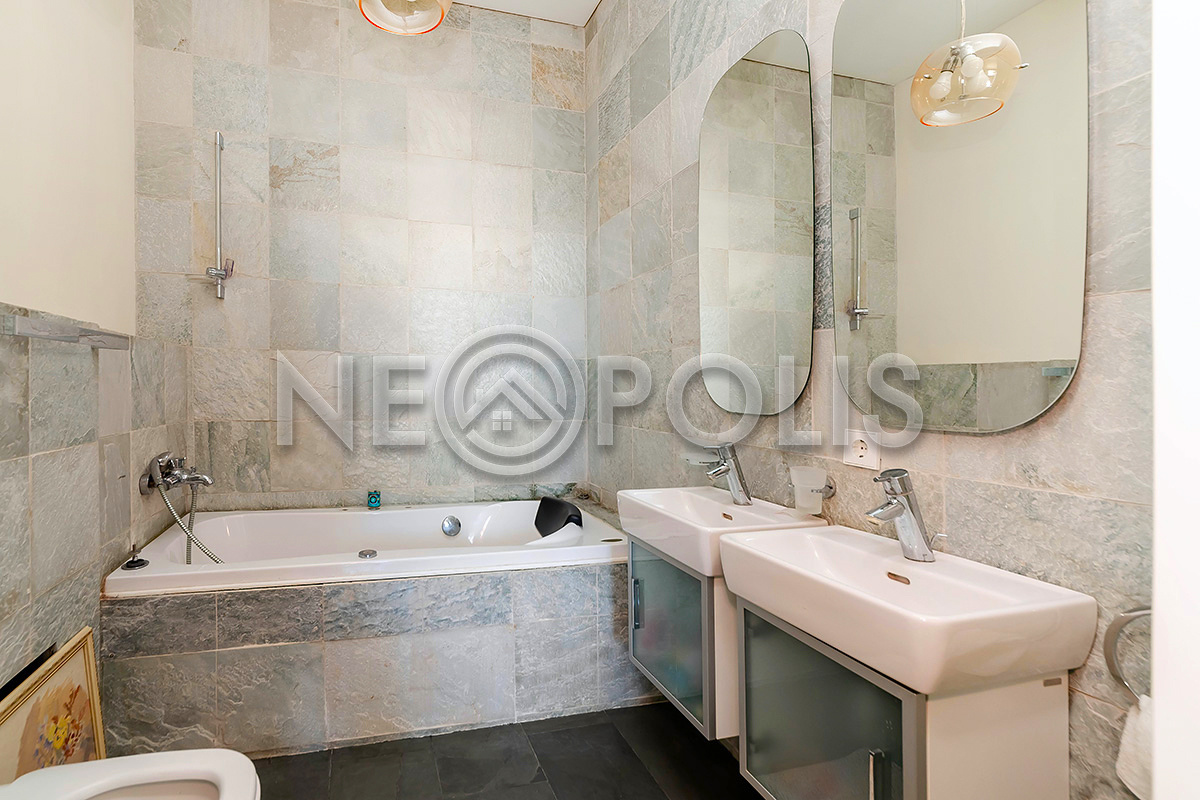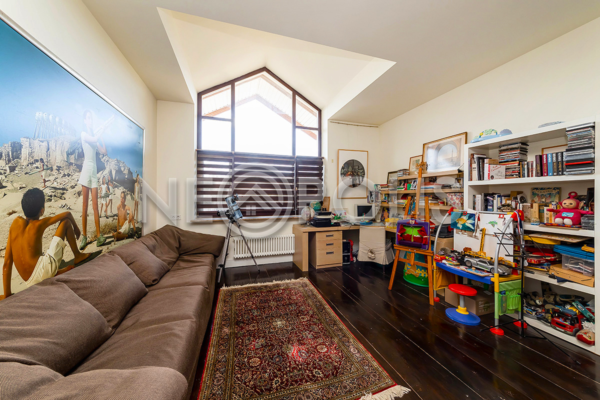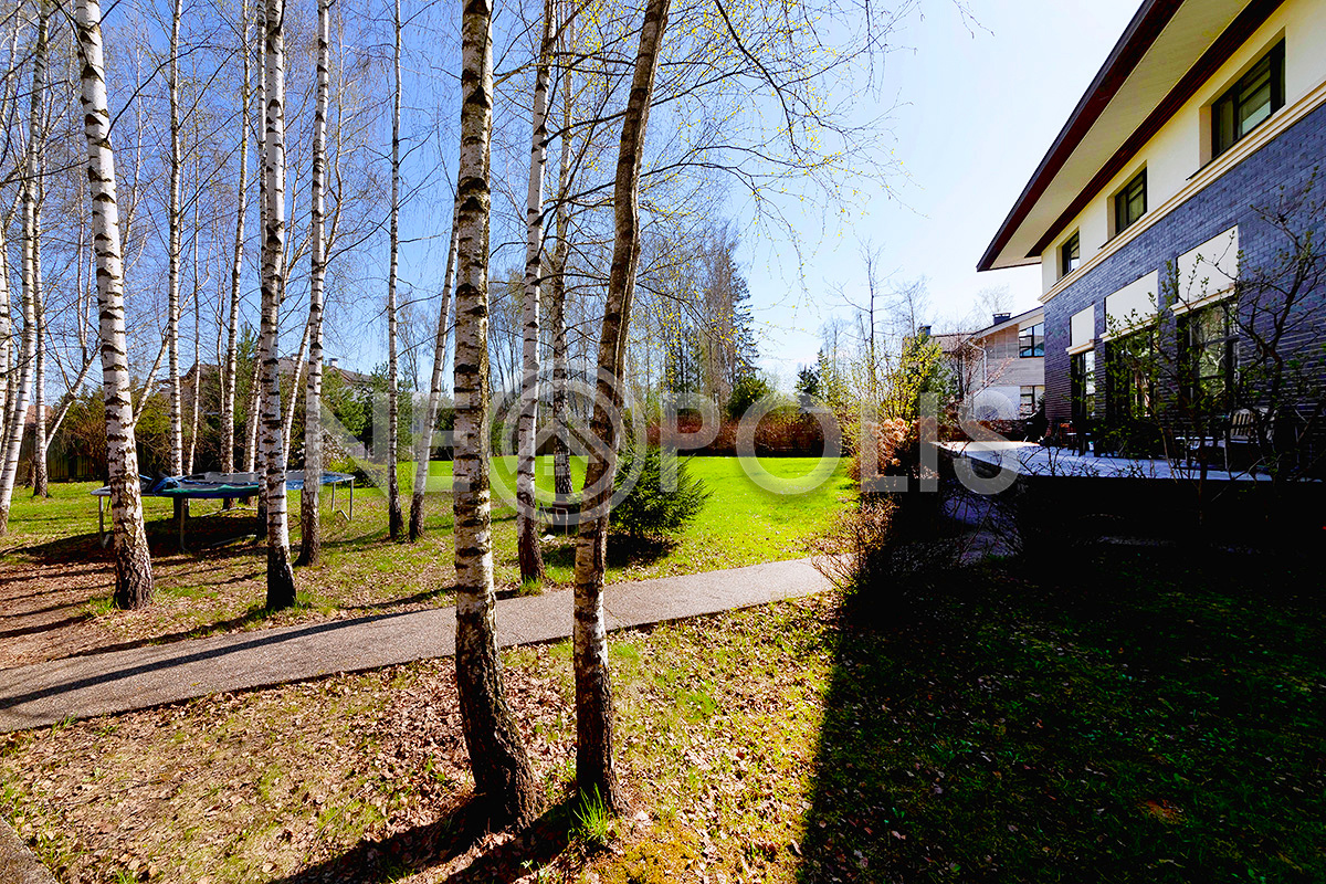 - Мебель: кухонный гарнитур марки Leicht, техника AEG и Kuppersbusch, столешница из натурального черного гранита, двусторонний камин марки Fabrilor, сауна Harvia