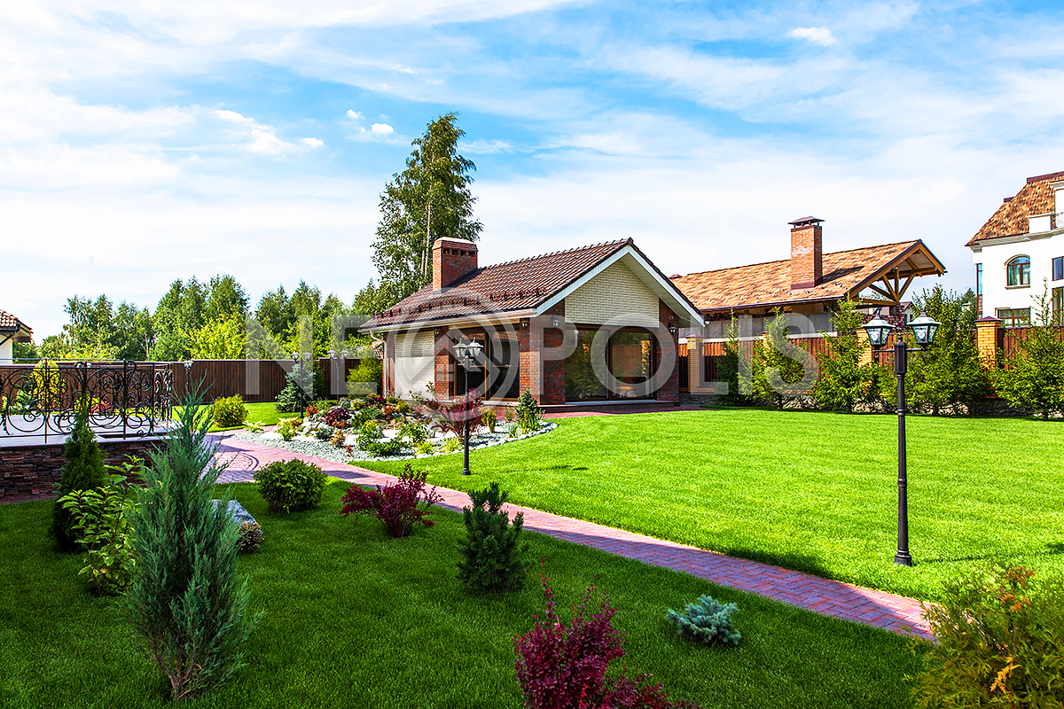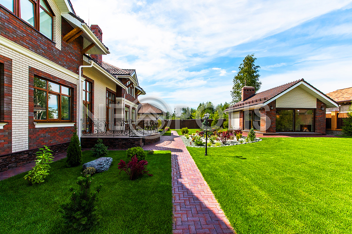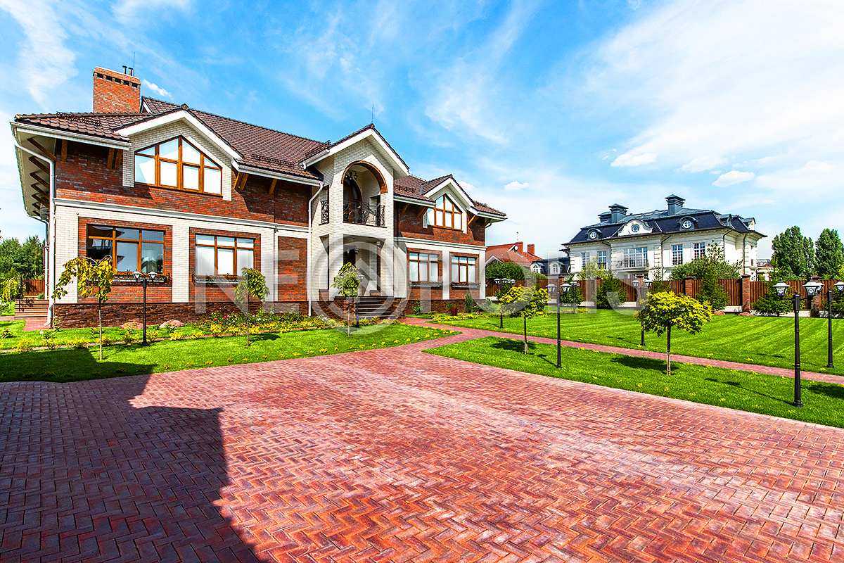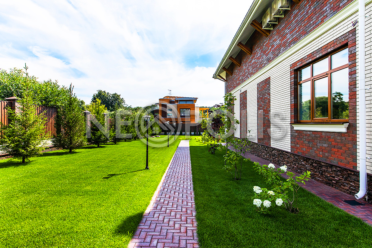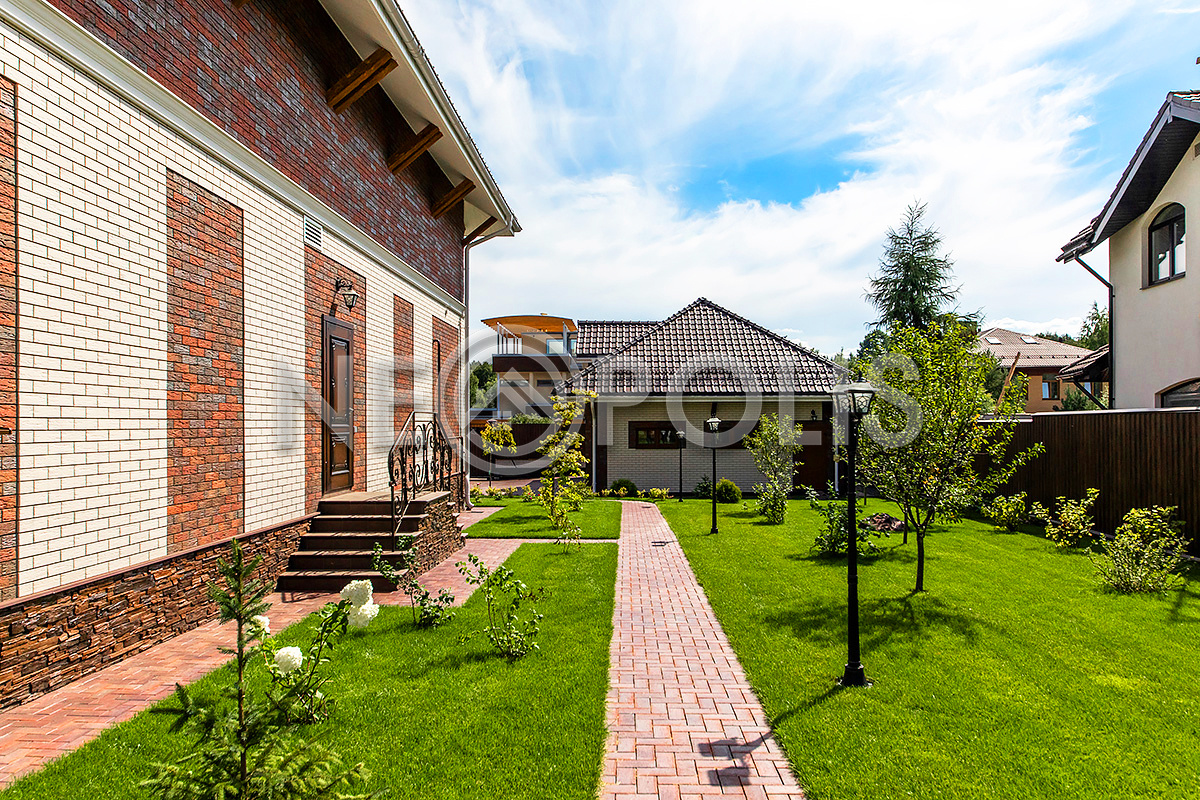 Дорожки вымощены брусчаткой, выполнен дренаж вокруг дома, есть уличное освещение.
