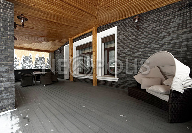 - 1-й этаж:просторная гостиная с камином и кухней, столовая, кабинет, санузел, кладовая, котельная, большая крытая терраса
